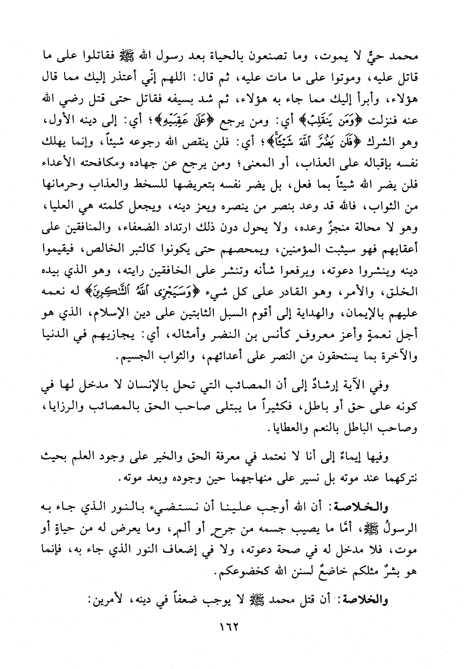 محمد حيٌّ لا يموت، وما تصنعون بالحياة بعد رسول الله - صلى الله عليه وسلم - فقاتلوا على ما قاتل عليه، وموتوا على ما مات عليه، ثم قال: اللهم إنّي أعتذر إليك مما قال هؤلاء، وأبرأ إليك مما جاء به هؤلاء، ثم شد بسيفه فقاتل حتى قتل رضي الله عنه فنزلت {وَمَنْ يَنْقَلِبْ} أي: ومن يرجع {عَلَى عَقِبَيْهِ}؛ أي: إلى دينه الأول، وهو الشرك {فَلَنْ يَضُرَّ اللَّهَ شَيْئًا}؛ أي: فلن ينقص الله رجوعه شيئًا، وإنما يهلك نفسه بإقباله على العذاب، أو المعنى؛ ومن يرجع عن جهاده ومكافحته الأعداء فلن يضر الله شيئًا بما فعل، بل يضر نفسه بتعريضها للسخط والعذاب وحرمانها من الثواب، فالله قد وعد بنصر من ينصره ويعز دينه، ويجعل كلمته هي العليا، وهو لا محالة منجزٌ وعده، ولا يحول دون ذلك ارتداد الضعفاء، والمنافقين على أعقابهم فهو سيثبت المؤمنين، ويمحصهم حتى يكونوا كالتبر الخالص، فيقيموا دينه وينشروا دعوته، ويرفعوا شأنه وتنشر على الخافقين رايته، وهو الذي بيده الخلق، والأمر، وهو القادر على كل شيء {وَسَيَجْزِي اللَّهُ الشَّاكِرِينَ} له نعمه عليهم بالإيمان, والهداية إلى أقوم السبل الثابتين على دين الإِسلام، الذي هو أجل نعمةٍ وأعز معروفٍ كأنس بن النضر وأمثاله، أي: يجازيهم في الدنيا والآخرة بما يستحقون من النصر على أعدائهم، والثواب الجسيم.