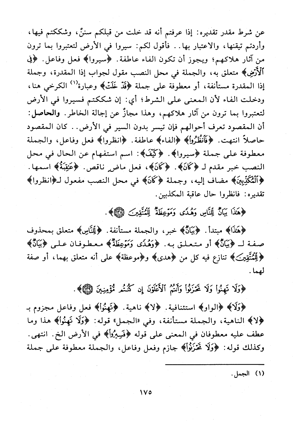 عن شرط مقدر تقديره: إذا عرفتم أنه قد خلت من قبلكم سننٌ، وشككتم فيها، وأردتم تيقنها، والاعتبار بها .. فأقول لكم: سيروا في الأرض لتعتبروا بما ترون من آثار هلاكهم؛ ويجوز أن تكون الفاء عاطفة. {سِيرُوا} فعل وفاعل. {فِي الْأَرْضِ} متعلق به، والجملة في محل النصب مقول لجواب إذا المقدرة، وجملة إذا المقدرة مستأنفة، أو معطوفة على جملة {قَدْ خَلَتْ} وعبارة (¬1) الكرخي هنا، ودخلت الفاء لأن المعنى على الشرط؛ أي: إن شككتم فسيروا في الأرض لتعتبروا بما ترون من آثار هلاكهم، وهذا مجازٌ عن إجالة الخاطر. والحاصل: أن المقصود تعرف أحوالهم فإن تيسر بدون السير في الأرض .. كان المقصود حاصلاً انتهت. {فَانْظُرُوا} {الفاء} عاطفة. {انْظُرُوا} فعل وفاعل، والجملة معطوفة على جملة {سِيرُوا}. {كَيْفَ}: اسم استفهام عن الحال في محل النصب خبر مقدم لـ {كاَنَ}. {كاَنَ}، فعل ماض ناقص. {عَاقِبَةُ} اسمها. {الْمُكَذِّبِينَ} مضاف إليه، وجملة {كاَنَ} في محل النصب مفعول لـ {انْظُرُوا} تقديره: فانظروا حال عاقبة المكذبين.