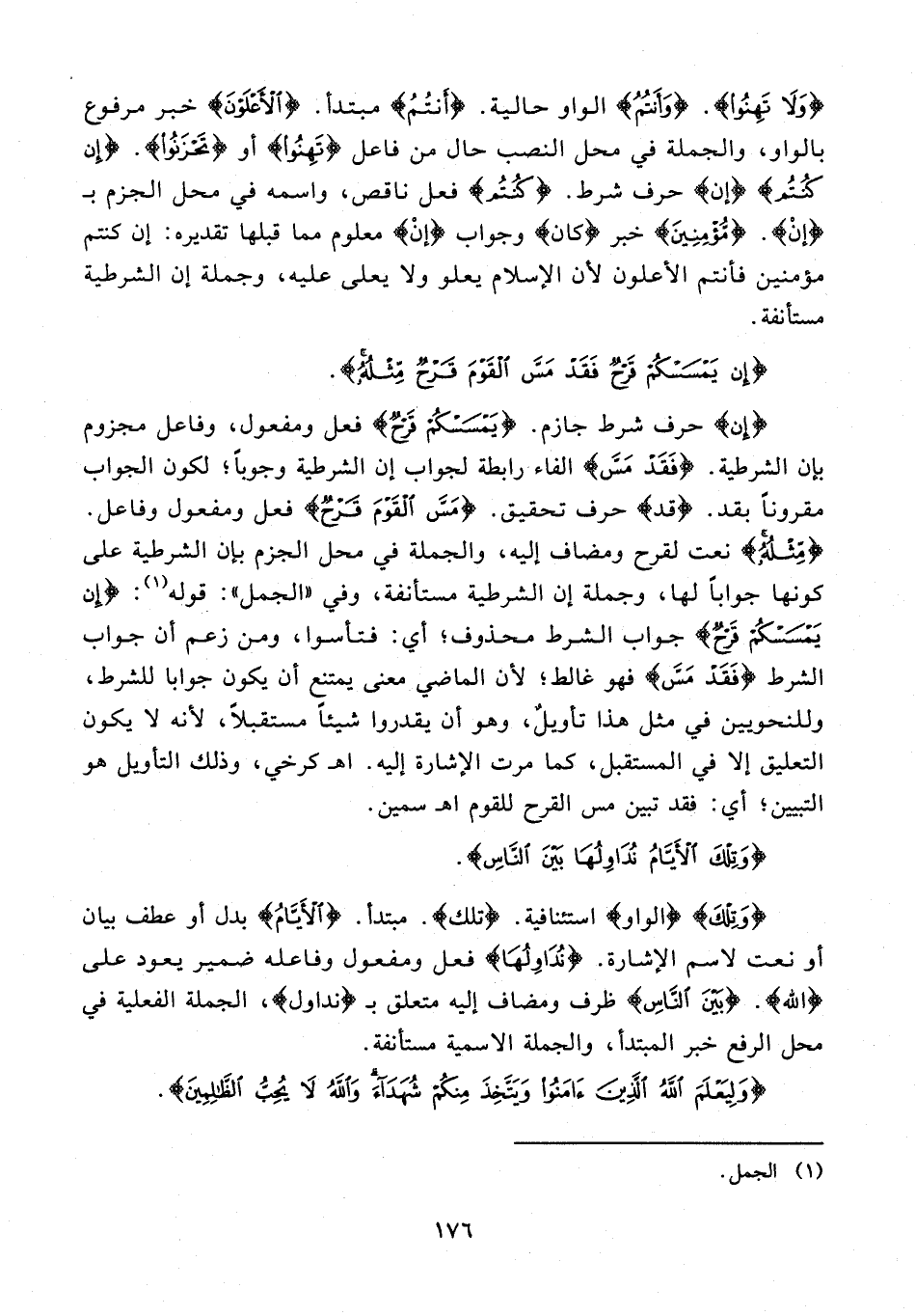 {وَلَا تَهِنُوا}. {وَأَنْتُمُ} الواو حالية. {أَنْتُمُ} مبتدأ. {الْأَعْلَوْنَ} خبر مرفوع بالواو، والجملة في محل النصب حال من فاعل {تَهِنُوا} أو {تَحْزَنُوا}. {إِنْ كُنْتُمْ} {إن} حرف شرط. {كُنْتُمْ} فعل ناقص، واسمه في محل الجزم بـ {إِنْ}. {مُؤْمِنِينَ} خبر {كان} وجواب {إنْ} معلوم مما قبلها تقديره: إن كنتم مؤمنين فأنتم الأعلون لأن الإِسلام يعلو ولا يعلى عليه، وجملة إن الشرطية مستأنفة.