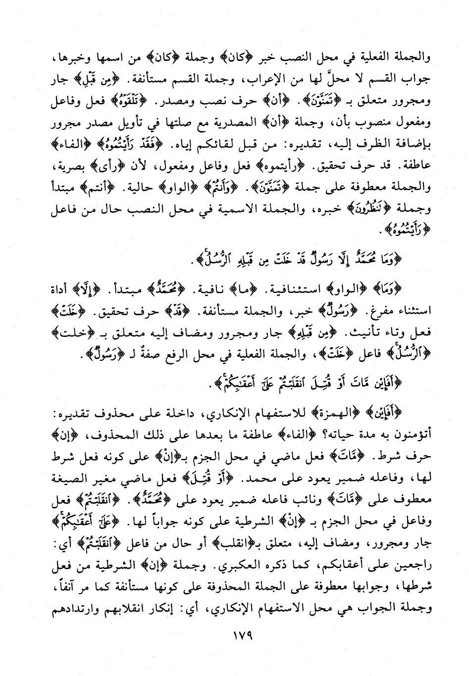 {أَفَإِنْ} {الهمزة} للاستفهام الإنكاري، داخلة على محذوف تقديره: أتؤمنون به مدة حياته؟ {الفاء} عاطفة ما بعدها على ذلك المحذوف، {إن} حرف شرط. {مَاتَ} فعل ماضي في محل الجزم بـ {إنْ} على كونه فعل شرط لها، وفاعله ضمير يعود على محمَّد. {أَوْ قُتِلَ} فعل ماضي مغير الصيغة معطوف على {مَاتَ} ونائب فاعله ضمير يعود على {مُحَمَّدٌ}. {انْقَلَبْتُمْ} فعل وفاعل في محل الجزم بـ {إنْ} الشرطية على كونه جوابًا لها. {عَلَى أَعْقَابِكُمْ} جار ومجرور، ومضاف إليه، متعلق بـ {انقلب} أو حال من فاعل {انْقَلَبْتُمْ} أي: راجعين على أعقابكم، كما ذكره العكبري. وجملة {إن} الشرطية من فعل شرطها، وجوابها معطوفة على الجملة المحذوفة على كونها مستأنفة كما مر آنفًا، وجملة الجواب هي محل الاستفهام الإنكاري، أي: إنكار انقلابهم وارتدادهم