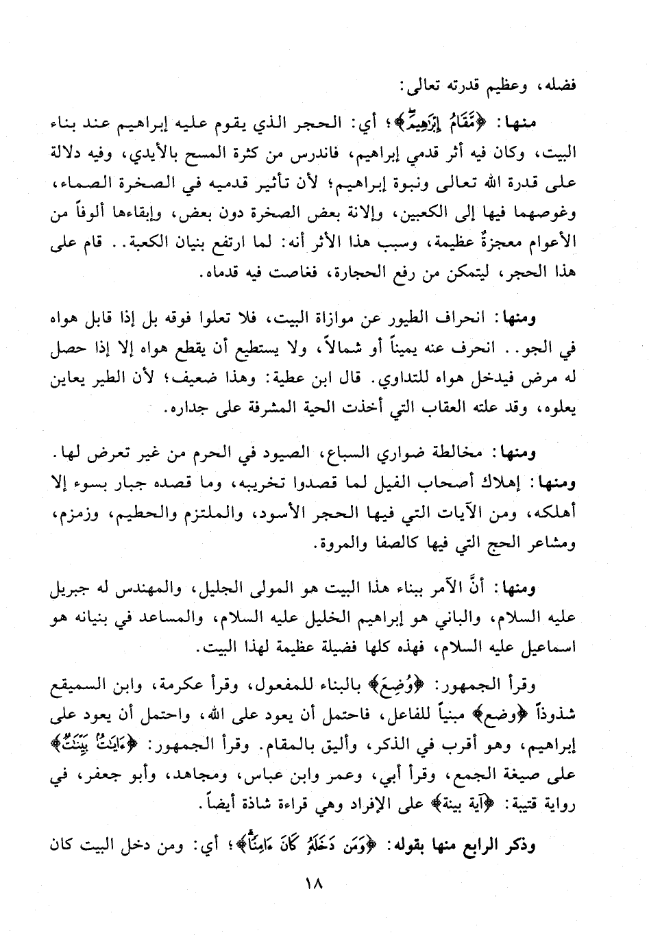 منها: {مَقَامُ إِبْرَاهِيمَ}؛ أي: الحجر الذي يقوم عليه إبراهيم عند بناء البيت، وكان فيه أثر قدمي إبراهيم، فاندرس من كثرة المسح بالأيدي، وفيه دلالة على قدرة الله تعالى ونبوة إبراهيم؛ لأن تأثير قدميه في الصخرة الصماء، وغوصهما فيها إلى الكعبين، وإلانة بعض الصخرة دون بعض، وإبقاءها ألوفًا من الأعوام معجزةٌ عظيمة، وسبب هذا الأثر أنه: لما ارتفع بنيان الكعبة .. قام على هذا الحجر، ليتمكن من رفع الحجارة، فغاصت فيه قدماه.