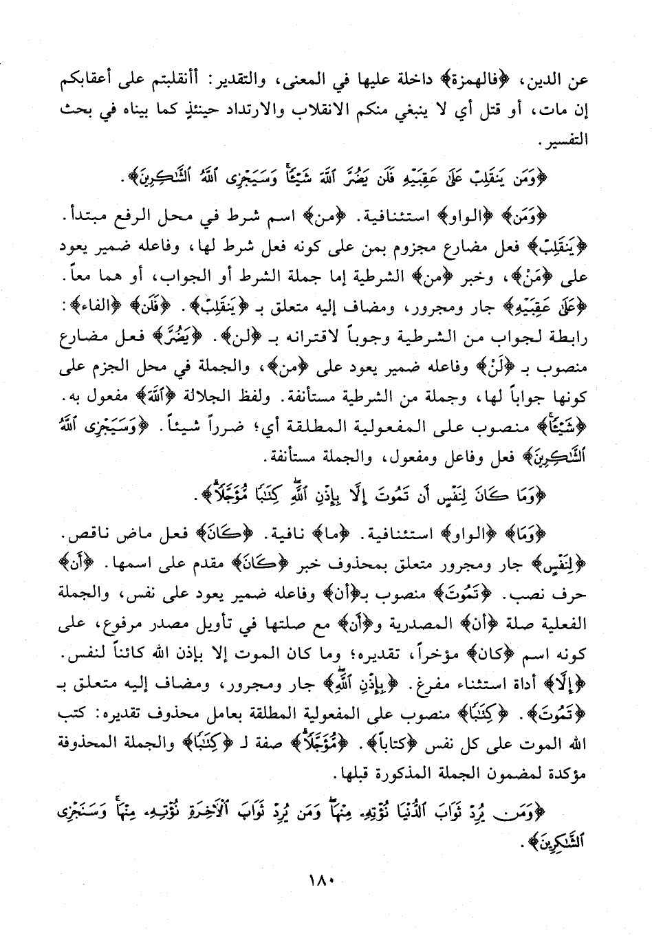{وَمَنْ} {الواو} استئنافية. {من} اسم شرط في محل الرفع مبتدأ. {يَنْقَلِبْ} فعل مضارع مجزوم بمن على كونه فعل شرط لها، وفاعله ضمير يعود على {مَنْ}، وخبر {من} الشرطية إما جملة الشرط أو الجواب، أو هما معًا. {عَلَى عَقِبَيْهِ} جار ومجرور، ومضاف إليه متعلق بـ {يَنْقَلِبْ}. {فَلَنْ} {الفاء}: رابطة لجواب من الشرطية وجوبًا لاقترانه بـ {لن}. {يَضُرَّ} فعل مضارع منصوب بـ {لَنْ} وفاعله ضمير يعود على {من}، والجملة في محل الجزم على كونها جوابًا لها، وجملة من الشرطية مستأنفة. ولفظ الجلالة {اللَّهَ} مفعول به. {شَيْئًا} منصوب على المفعولية المطلقة أي؛ ضررًا شيئًا. {وَسَيَجْزِي اللَّهُ الشَّاكِرِينَ} فعل وفاعل ومفعول، والجملة مستأنفة.