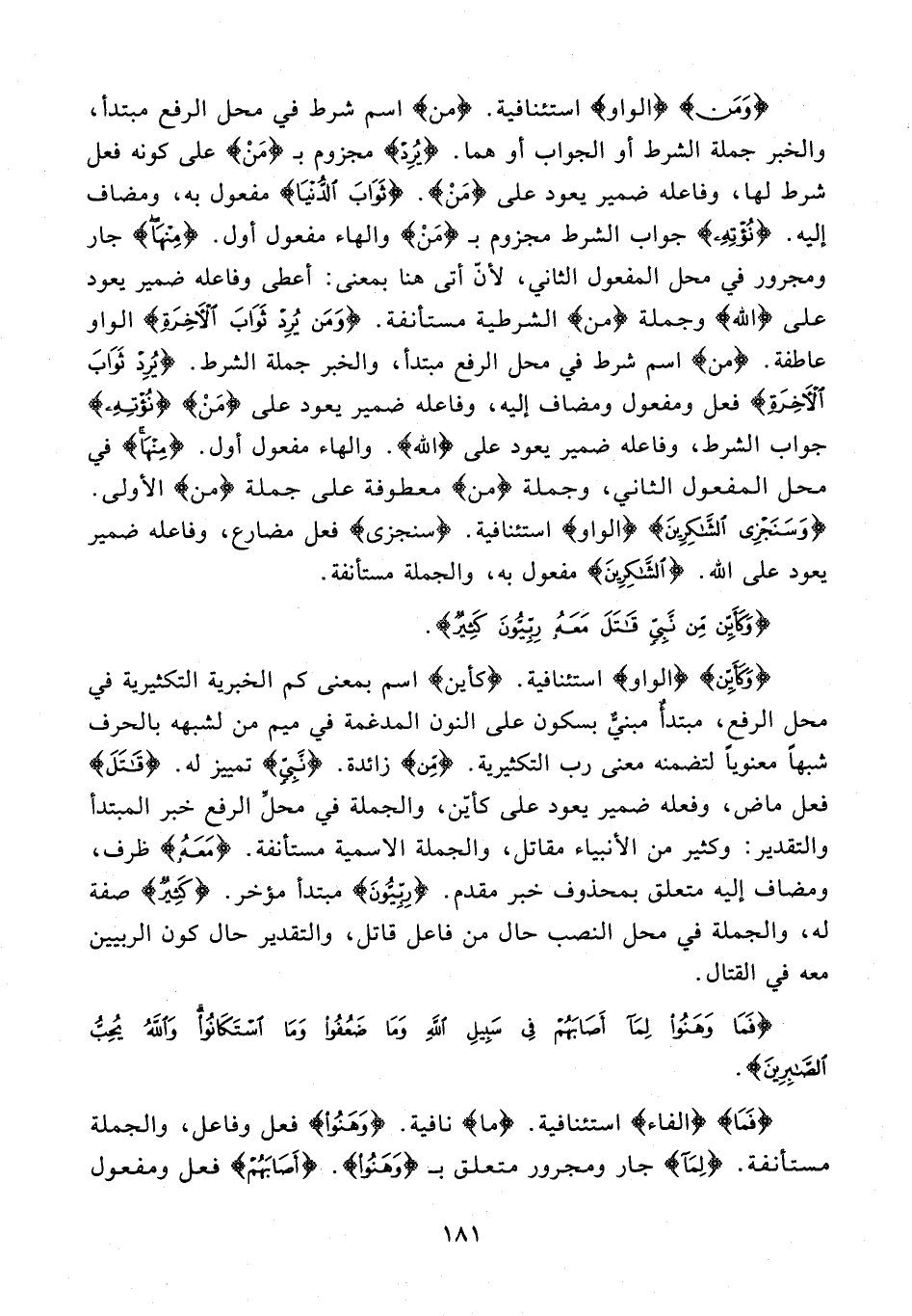 {وَمَنْ} {الواو} استئنافية. {من} اسم شرط في محل الرفع مبتدأ، والخبر جملة الشرط أو الجواب أو هما. {يُرِدْ} مجزوم بـ {مَنْ} على كونه فعل شرط لها، وفاعله ضمير يعود على {مَنْ}. {ثَوَابَ الدُّنْيَا} مفعول به، ومضاف إليه. {نُؤْتِهِ} جواب الشرط مجزوم بـ {مَنْ} والهاء مفعول أول. {مِنْهَا} جار ومجرور في محل المفعول الثاني؛ لأنّ أتى هنا بمعنى: أعطى وفاعله ضمير يعود على {اللَّه} وجملة من الشرطية مستأنفة. {وَمَنْ يُرِدْ ثَوَابَ الْآخِرَةِ} الواو عاطفة. {من} اسم شرط في محل الرفع مبتدأ، والخبر جملة الشرط. {يُرِدْ ثَوَابَ الْآخِرَةِ} فعل ومفعول ومضاف إليه، وفاعله ضمير يعود على {مَنْ} {نُؤْتِهِ} جواب الشرط، وفاعله ضمير يعود على {اللَّه}. والهاء مفعول أول. {مِنْهَا} في محل المفعول الثاني، وجملة {من} معطوفة على جملة {من} الأولى. {وَسَنَجْزِي الشَّاكِرِينَ} {الواو} استئنافية. {سَنَجْزِي} فعل مضارع، وفاعله ضمير يعود على الله. {الشَّاكِرِينَ} مفعول به، والجملة مستأنفة.