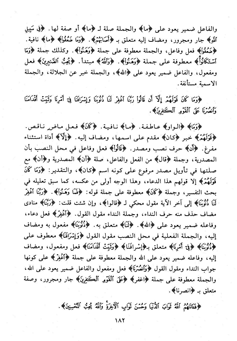 {وَمَا} {الواو} عاطفة. {ما} نافية. {كَانَ} فعل ماضٍ ناقص. {قَوْلَهُمْ} خبر {كان} مقدم على اسمها، ومضاف إليه. {إِلَّا} أداة استثناء مفرغ. {أَنْ} حرف نصب ومصدر. {قَالُوا} فعل وفاعل في محل النصب بأن المصدرية، وجملة {قال} من الفعل والفاعل، صلة {أن} المصدرية و {أن} مع صلتها في تأويل مصدر مرفوع على كونه اسم {كان} والتقدير: {وَمَا كَانَ قَوْلَهُمْ} إلا قولهم هذا الدعاء، وهذا الوجه أولى من عكسه، كما سبق تعليله في بحث التفسير، وجملة {كَانَ} معطوفة على جملة قوله: {فَمَا وَهَنُوا}. {رَبَّنَا اغْفِرْ لَنَا ذُنُوبَنَا} إلى آخر الآية مقول محكي لـ {قَالُوا}، وإن شئت قلت: {رَبَّنَا} منادى مضاف حذف منه حرف النداء، وجملة النداء مقول القول. {اغْفِرْ} فعل دعاء، وفاعله ضمير يعود على {الله}. {لَنَا} متعلق به. {ذُنُوبَنَا} مفعول به ومضاف إليه، والجملة الفعلية في محل النصب مقول القول {وَإِسْرَافَنَا} معطوف على {ذُنُوبَنَا} {فِي أَمْرِنَا} متعلق بـ {إِسْرَافَنَا} {وَثَبِّتْ أَقْدَامَنَا} فعل ومفعول، ومضاف إليه، وفاعله ضمير يعود على الله والجملة معطوفة على جملة {اغْفِرْ} على كونها جواب النداء ومقول القول {وَانْصُرْنَا} فعل ومفعول والفاعل ضمير يعود على الله، والجملة معطوفة على جملة {اغْفِرْ} {عَلَى الْقَوْمِ الْكَافِرِينَ} جار ومجرور، وصفة متعلق بـ {انْصُرْنَا}.