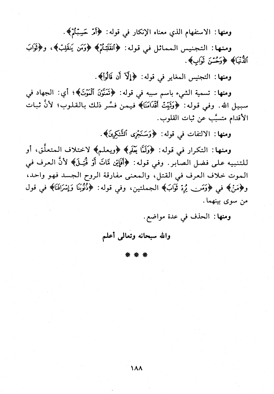ومنها: التكرار في قوله: {وَلَمَّا يَعْلَمِ} {ويعلم} لاختلاف المتعلَّق، أو للتنبيه على فضل الصابر. وفي قوله: {أَفَإِنْ مَاتَ أَوْ قُتِلَ} لأنَّ العرف في الموت خلاف العرف في القتل، والمعنى مفارقة الروح الجسد فهو واحد، و {مَنْ} في {وَمَنْ يُرِدْ ثَوَابَ} الجملتين، وفي قوله: {ذُنُوبَنَا وَإِسْرَافَنَا} في قول من سوى بينهما.