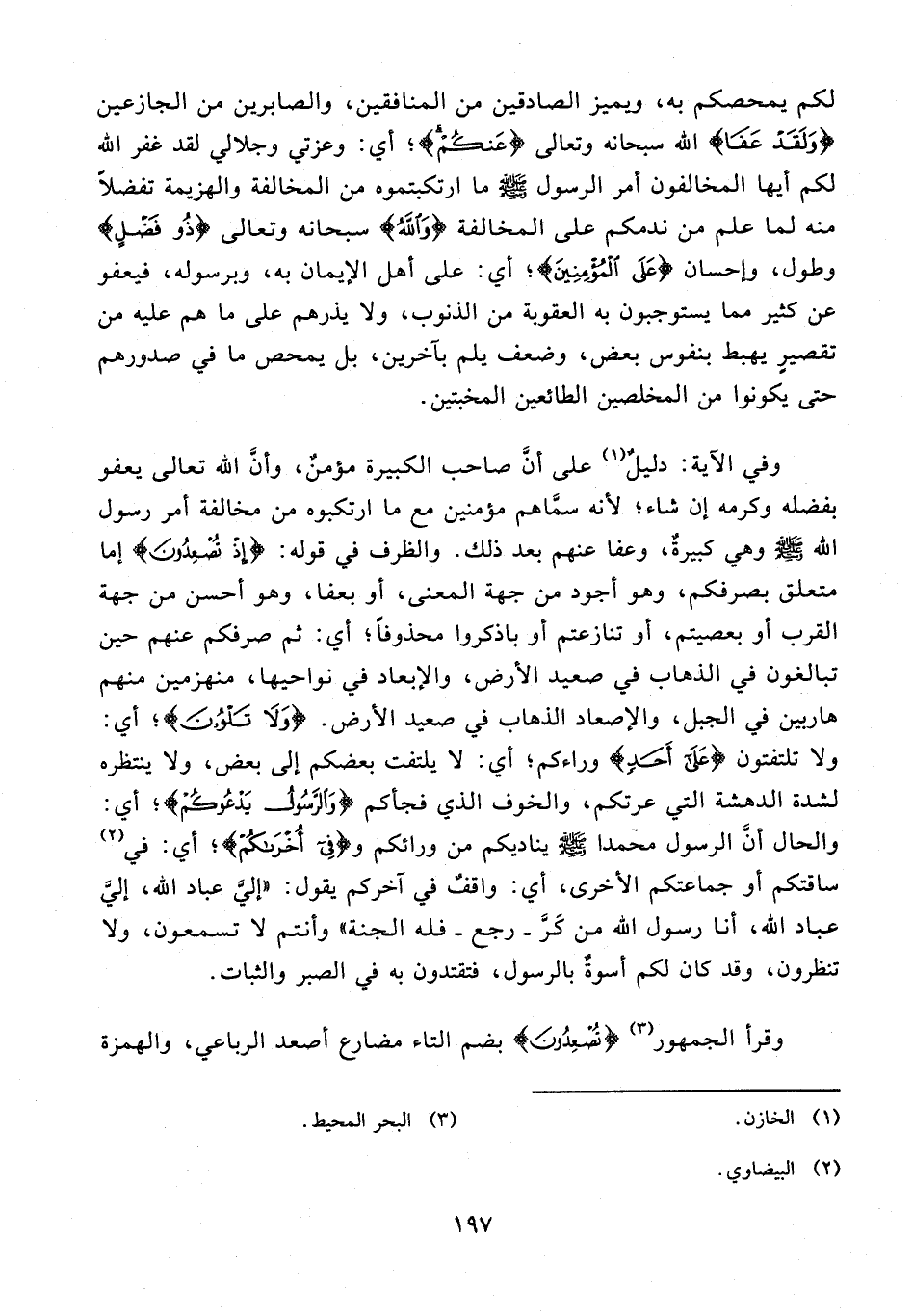 153 - وفي الآية: دليلٌ (¬1) على أنَّ صاحب الكبيرة مؤمنٌ، وأنَّ الله تعالى يعفو بفضله وكرمه إن شاء؛ لأنه سمَّاهم مؤمنين مع ما ارتكبوه من مخالفة أمر رسول الله - صلى الله عليه وسلم - وهي كبيرةٌ، وعفا عنهم بعد ذلك. والظرف في قوله: {إِذْ تُصْعِدُونَ} إما متعلق بصرفكم، وهو أجود من جهة المعنى، أو بعفا، وهو أحسن من جهة القرب أو بعصيتم، أو تنازعتم أو باذكروا محذوفًا؛ أي: ثم صرفكم عنهم حين تبالغون في الذهاب في صعيد الأرض، والإبعاد في نواحيها، منهزمين منهم هاربين في الجبل، والإصعاد الذهاب في صعيد الأرض. {وَلَا تَلْوُونَ}؛ أي: ولا تلتفتون {عَلَى أَحَدٍ} وراءكم؛ أي: لا يلتفت بعضكم إلى بعض، ولا ينتظره لشدة الدهشة التي عرتكم، والخوف الذي فجأكم {وَالرَّسُولُ يَدْعُوكُمْ}؛ أي: والحال أنَّ الرسول محمدا - صلى الله عليه وسلم - يناديكم من ورائكم و {فِي أُخْرَاكُمْ}؛ أي: في (¬2) ساقتكم أو جماعتكم الآخرى، أي: واقفٌ في آخركم يقول: "إليَّ عباد الله، إليَّ عباد الله، أنا رسول الله من كَرَّ - رجع - فله الجنة" وأنتم لا تسمعون، ولا تنظرون، وقد كان لكم أسوةٌ بالرسول، فتقتدون به في الصبر والثبات.
