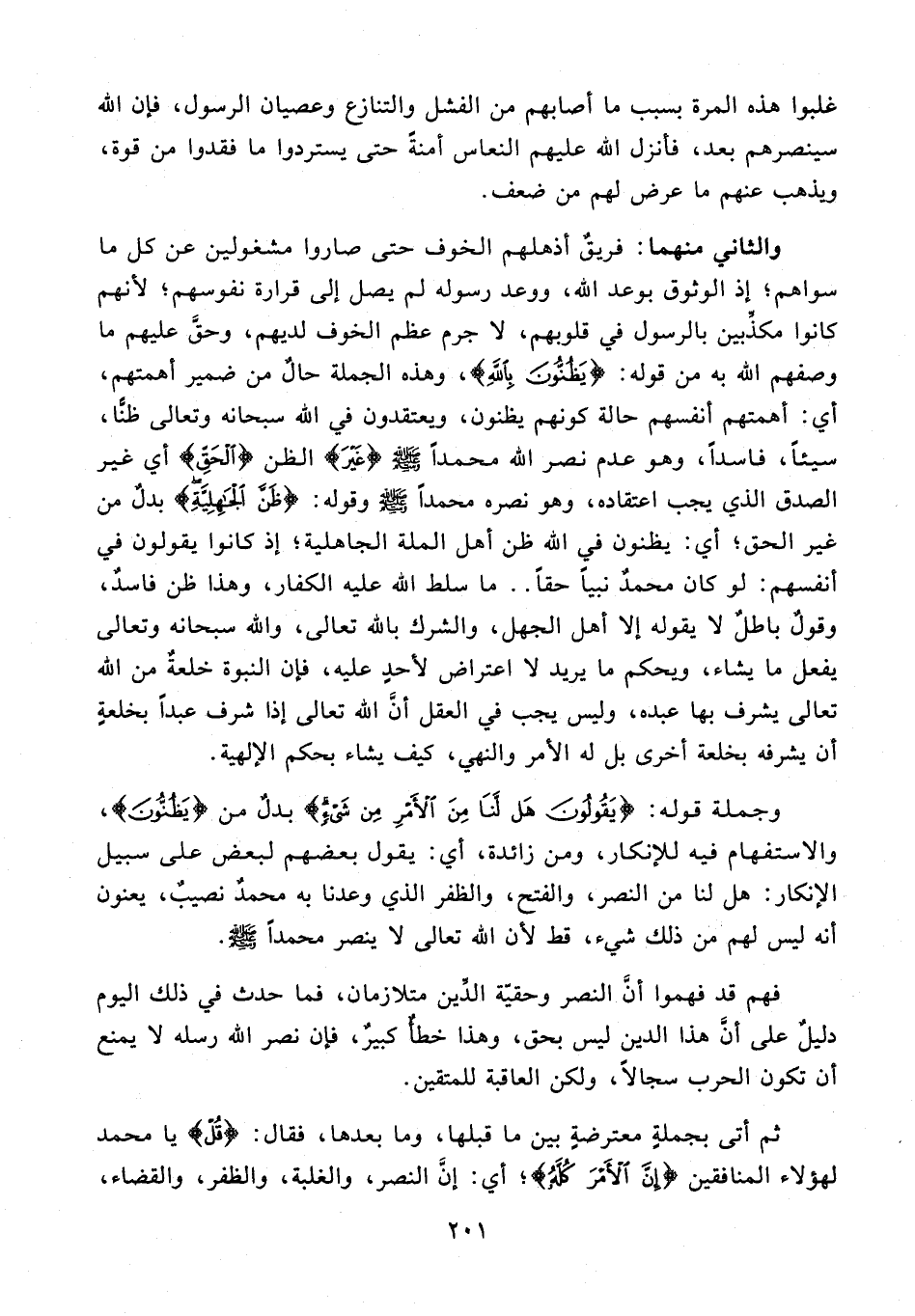 والثاني منهما: فريقٌ أذهلهم الخوف حتى صاروا مشغولين عن كل ما سواهم؛ إذ الوثوق بوعد الله، ووعد رسوله لم يصل إلى قرارة نفوسهم؛ لأنهم كانوا مكذِّبين بالرسول في قلوبهم، لا جرم عظم الخوف لديهم، وحقَّ عليهم ما وصفهم الله به من قوله: {يَظُنُّونَ بِاللَّهِ}، وهذه الجملة حالٌ من ضمير أهمتهم، أي: أهمتهم أنفسهم حالة كونهم يظنون، ويعتقدون في الله سبحانه وتعالى ظنًّا، سيئًا، فاسدًا، وهو عدم نصر الله محمدًا - صلى الله عليه وسلم - {غَيْرَ} الظن {الْحَقِّ} أي غير الصدق الذي يجب اعتقاده، وهو نصره محمدًا - صلى الله عليه وسلم - وقوله: {ظَنَّ الْجَاهِلِيَّةِ} بدلٌ من غير الحق؛ أي: يظنون في الله ظن أهل الملة الجاهلية؛ إذ كانوا يقولون في أنفسهم: لو كان محمدٌ نبيًّا حقًّا .. ما سلط الله عليه الكفار، وهذا ظن فاسدٌ، وقولٌ باطلٌ لا يقوله إلا أهل الجهل، والشرك بالله تعالى، والله سبحانه وتعالى يفعل ما يشاء، ويحكم ما يريد لا اعتراض لأحدٍ عليه، فإن النبوة خلعةٌ من الله تعالى يشرف بها عبده، وليس يجب في العقل أن الله تعالى إذا شرف عبدًا بخلعةٍ أن يشرفه بخلعة أخرى بل له الأمر والنهي، كيف يشاء بحكم الإلهية.
