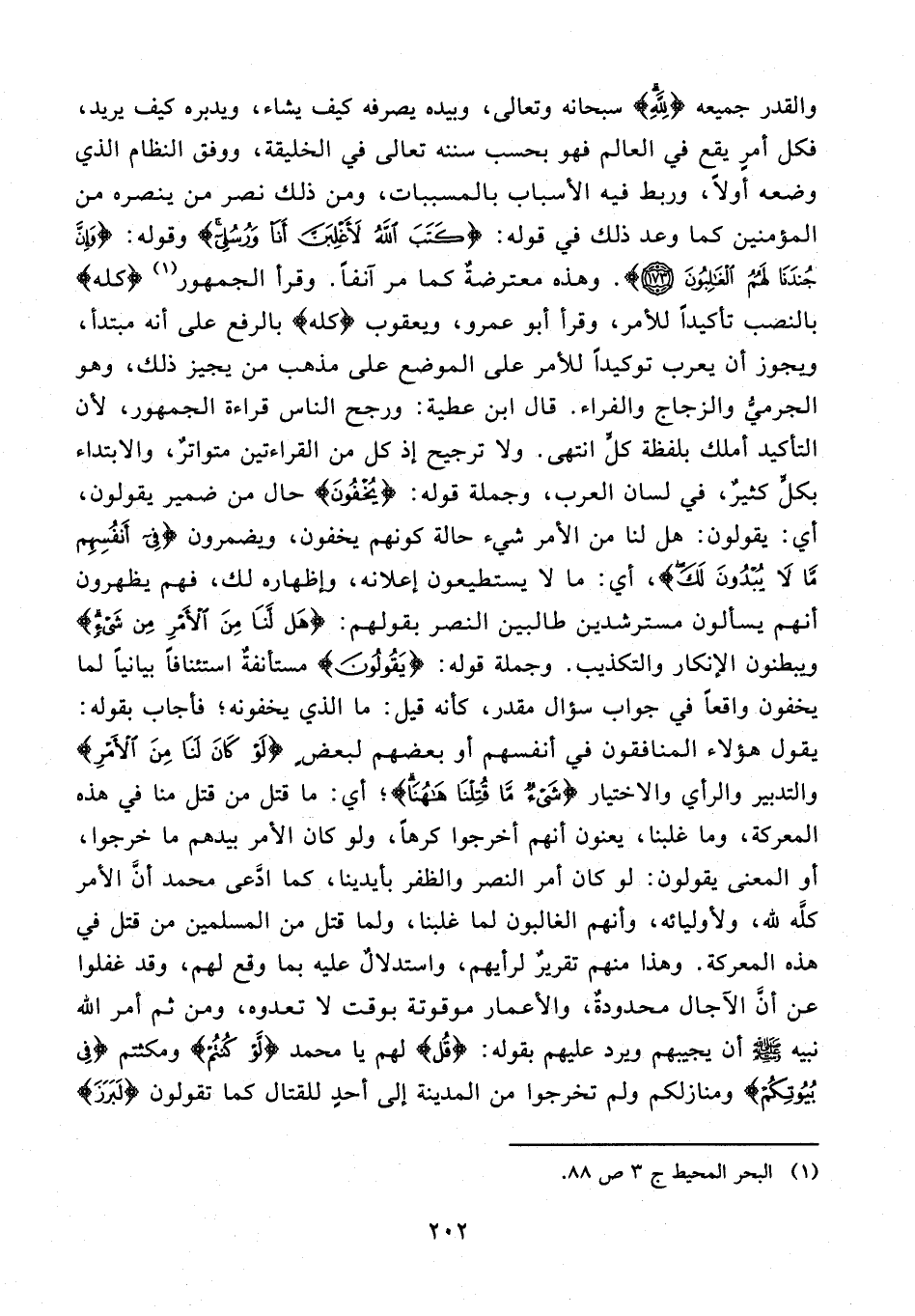 والقدر جميعه {لِلَّهِ} سبحانه وتعالى، وبيده يصرفه كيف يشاء، ويدبره كيف يريد، فكل أمرٍ يقع في العالم فهو بحسب سننه تعالى في الخليقة، ووفق النظام الذي وضعه أولًا، وربط فيه الأسباب بالمسببات، ومن ذلك نصر من ينصره من المؤمنين كما وعد ذلك في قوله: {كَتَبَ اللَّهُ لَأَغْلِبَنَّ أَنَا وَرُسُلِي} وقوله: {وَإِنَّ جُنْدَنَا لَهُمُ الْغَالِبُونَ (173)}. وهذه معترضةٌ كما مر آنفًا. وقرأ الجمهور (¬1) {كله} بالنصب تأكيدًا للأمر، وقرأ أبو عمرو، ويعقوب {كله} بالرفع على أنه مبتدأ، ويجوز أن يعرب توكيدًا للأمر على الموضع على مذهب من يجيز ذلك، وهو الجرميُّ والزجاج والفراء. قال ابن عطية: ورجح الناس قراءة الجمهور، لأن التأكيد أملك بلفظة كلٍّ انتهى. ولا ترجيح إذ كل من القراءتين متواترٌ، والابتداء بكلٍّ كثيرٌ، في لسان العرب، وجملة قوله: {يُخْفُونَ} حال من ضمير يقولون، أي: يقولون: هل لنا من الأمر شيء حالة كونهم يخفون، ويضمرون {فِي أَنْفُسِهِمْ مَا لَا يُبْدُونَ لَكَ}، أي: ما لا يستطيعون إعلانه، وإظهاره لك، فهم يظهرون أنهم يسألون مسترشدين طالبين النصر بقولهم: {هَلْ لَنَا مِنَ الْأَمْرِ مِنْ شَيْءٍ} ويبطنون الإنكار والتكذيب. وجملة قوله: {يَقُولُونَ} مستأنفةٌ استئنافًا بيانيًّا لما يخفون واقعًا في جواب سؤال مقدر، كأنه قيل: ما الذي يخفونه؛ فأجاب بقوله: يقول هؤلاء المنافقون في أنفسهم أو بعضهم لبعضٍ {لَوْ كَانَ لَنَا مِنَ الْأَمْرِ} والتدبير والرأي والاختيار {شَيْءٌ مَا قُتِلْنَا هَاهُنَا}؛ أي: ما قتل من قتل منا في هذه المعركة، وما غلبنا، يعنون أنهم أخرجوا كرهًا، ولو كان الأمر بيدهم ما خرجوا، أو المعنى يقولون: لو كان أمر النصر والظفر بأيدينا، كما ادَّعى محمد أنَّ الأمر كلَّه لله، ولأوليائه، وأنهم الغالبون لما غلبنا، ولما قتل من المسلمين من قتل في هذه المعركة. وهذا منهم تقريرٌ لرأيهم، واستدلالٌ عليه بما وقع لهم، وقد غفلوا عن أنَّ الآجال محدودةٌ، والأعمار موقوتة بوقت لا تعدوه، ومن ثم أمر الله نبيه - صلى الله عليه وسلم - أن يجيبهم ويرد عليهم بقوله: {قُلْ} لهم يا محمد {لَوْ كُنْتُمْ} ومكثتم {فِي بُيُوتِكُمْ} ومنازلكم ولم تخرجوا من المدينة إلى أحدٍ للقتال كما تقولون {لَبَرَزَ}