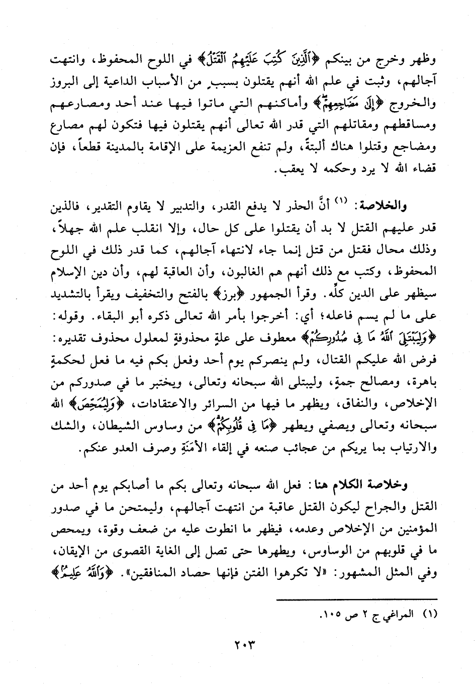 والخلاصة: (¬1) أنَّ الحذر لا يدفع القدر، والتدبير لا يقاوم التقدير، فالذين قدر عليهم القتل لا بد أن يقتلوا على كل حال، وإلا انقلب علم الله جهلًا، وذلك محال فقتل من قتل إنما جاء لانتهاء آجالهم، كما قدر ذلك في اللوح المحفوظ، وكتب مع ذلك أنهم هم الغالبون، وأن العاقبة لهم، وأن دين الإسلام سيظهر على الدين كلِّه. وقرأ الجمهور {برز} بالفتح والتخفيف ويقرأ بالتشديد على ما لم يسم فاعله؛ أي: أخرجوا بأمر الله تعالى ذكره أبو البقاء. وقوله: {وَلِيَبْتَلِيَ اللَّهُ مَا فِي صُدُورِكُمْ} معطوف على علةٍ محذوفةٍ لمعلول محذوف تقديره: فرض الله عليكم القتال، ولم ينصركم يوم أحد وفعل بكم فيه ما فعل لحكمةٍ باهرة، ومصالح جمةٍ، وليبتلى الله سبحانه وتعالى، ويختبر ما في صدوركم من الإخلاص، والنفاق، ويظهر ما فيها من السرائر والاعتقادات، {وَلِيُمَحِّصَ} الله سبحانه وتعالى ويصفي ويطهر {مَا فِي قُلُوبِكُمْ} من وساوس الشيطان، والشك والارتياب بما يريكم من عجائب صنعه في إلقاء الأمَنَةِ وصرف العدو عنكم.