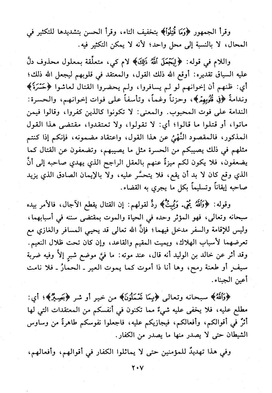 واللام في قوله: {لِيَجْعَلَ اللَّهُ ذَلِكَ} لام كي، متعلِّقة بمعلول محذوف دلَّ عليه السياق تقديره: أوقع الله ذلك القول، والمعتقد في قلوبهم ليجعل الله ذلك؛ أي: ظنهم أن إخوانهم لو لم يسافروا، ولم يحضروا القتال لعاشوا {حَسْرَةً} وندامةً {فِي قُلُوبِهِمْ}، وحزنًا وغمًّا، وتأسفًا على فوات إخوانهم، والحسرة: الندامة على فوت المحبوب. والمعنى: لا تكونوا كالذين كفروا، وقالوا فيمن ماتوا، أو قتلوا ما قالوا؛ أي: لا تقولوا، ولا تعتقدوا، مقتضى هذا القول المذكور، فالمقصود النَّهْيُ عن هذا القول، واعتقاد مضمونه، فإنكم إذا كنتم مثلهم في ذلك يصيبكم من الحسرة مثل ما يصيبهم، وتضعفون عن القتال كما يضعفون، فلا يكون لكم ميزةٌ عنهم بالعقل الراجح الذي يهدي صاحبه إلى أنَّ الذي وقع كان لا بد أن يقع، فلا يتحسَّر عليه، ولا بالإيمان الصادق الذي يزيد صاحبه إيقانًا وتسليمًا بكل ما يجري به القضاء.