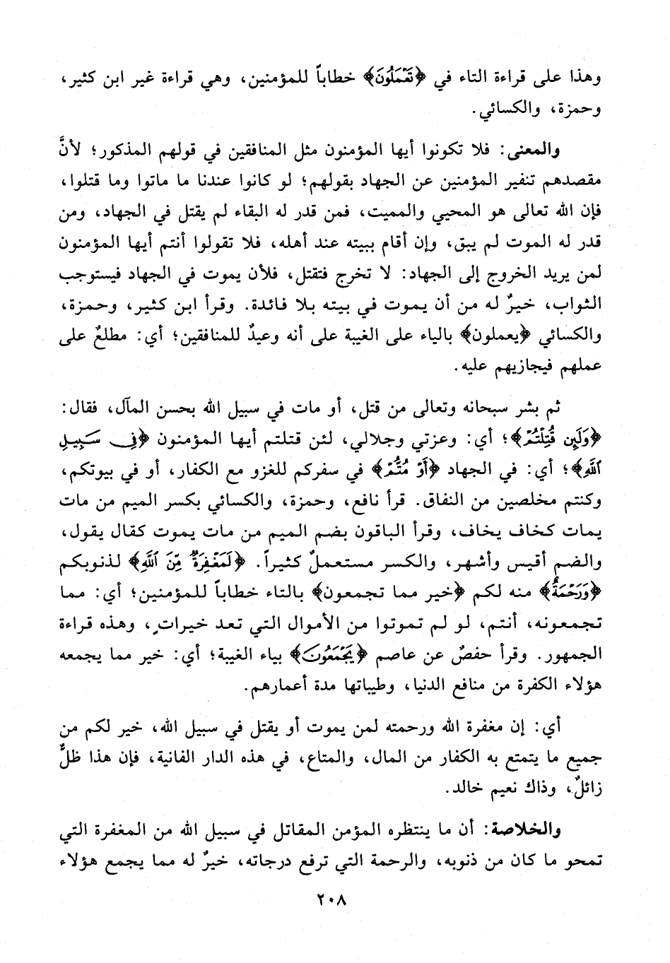 157 - ثم بشر سبحانه وتعالى من قتل، أو مات في سبيل الله بحسن المآل، فقال: {وَلَئِنْ قُتِلْتُمْ}؛ أي: وعزتي وجلالي، لئن قتلتم أيها المؤمنون {فِي سَبِيلِ اللَّهِ}؛ أي: في الجهاد {أَوْ مُتُّمْ} في سفركم للغزو مع الكفار، أو في بيوتكم، وكنتم مخلصين من النفاق. قرأ نافع، وحمزة، والكسائي بكسر الميم من مات يمات كخاف يخاف، وقرأ الباقون بضم الميم من مات يموت كقال يقول، والضم أقيس وأشهر، والكسر مستعمل كثيرًا. {لَمَغْفِرَةٌ مِنَ اللَّهِ} لذنوبكم {وَرَحْمَةٌ} منه لكم {خير مما تجمعون} بالتاء خطابًا للمؤمنين؛ أي: مما تجمعونه، أنتم، لو لم تموتوا من الأموال التي تعد خيراتٍ، وهذه قراءة الجمهور. وقرأ حفصٌ عن عاصم {يَجْمَعُونَ} بياء الغيبة؛ أي: خير مما يجمعه هؤلاء الكفرة من منافع الدنيا، وطيباتها مدة أعمارهم.