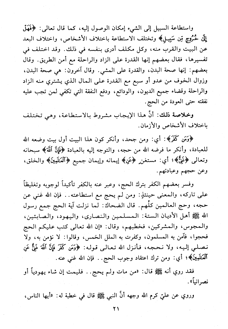 وخلاصة ذلك: أنَّ هذا الإيجاب مشروط بالاستطاعة، وهي تختلف باختلاف الأشخاص والأزمان.