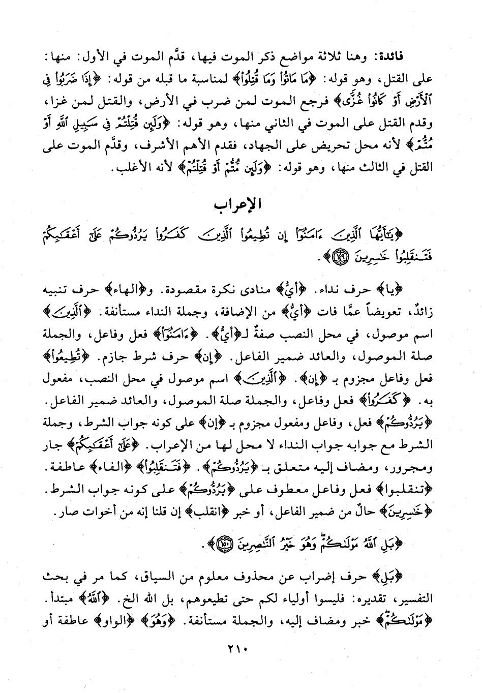 {يا} حرف نداء. {أيُّ} منادى نكرة مقصودة. و {الهاء} حرف تنبيه زائدٌ، تعويضًا عمَّا فات {أيُّ} من الإضافة، وجملة النداء مستأنفة. {الَّذِينَ} اسم موصول، في محل النصب صفةٌ لـ {أيُّ}. {آمَنُوا} فعل وفاعل، والجملة صلة الموصول، والعائد ضمير الفاعل. {إن} حرف شرط جازم. {تُطِيعُوا} فعل وفاعل مجزوم بـ {إِن}. {الَّذِينَ} اسم موصول في محل النصب، مفعول به. {كَفَرُوا} فعل وفاعل، والجملة صلة الموصول، والعائد ضمير الفاعل. {يَرُدُّوكُمْ} فعل، وفاعل ومفعول مجزوم بـ {إن} على كونه جواب الشرط، وجملة الشرط مع جوابه جواب النداء لا محل لها من الإعراب. {عَلَى أَعْقَابِكُمْ} جار ومجرور، ومضاف إليه متعلق بـ {يَرُدُّوكُمْ}. {فَتَنْقَلِبُوا} {الفاء} عاطفة. {تنقلبوا} فعل وفاعل معطوف على {يَرُدُّوكُمْ} على كونه جواب الشرط. {خَاسِرِينَ} حال من ضمير الفاعل، أو خبر {انقلب} إن قلنا إنه من أخوات صار.