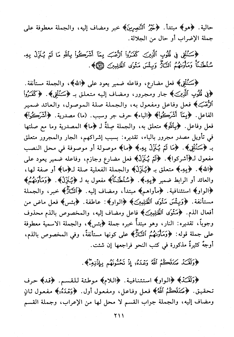 {سَنُلْقِي} فعل مضارع، وفاعله ضمير يعود على {الله} والجملة مستأنفة. {فِي قُلُوبِ الَّذِينَ} جار ومجرور، ومضاف إليه متعلق بـ {سَنُلْقِي}. {كَفَرُوا الرُّعْبَ} فعل وفاعل ومفعول به، والجملة صلة الموصول، والعائد ضمير الفاعل. {بِمَا أَشْرَكُوا} {الباء} حرف جر وسبب. (ما) مصدرية. {أَشْرَكُوا} فعل وفاعل. {بِاللَّهِ} متعلق به، والجملة صِلةٌ لـ {ما} المصدرية وما مع صلتها في تأويل مصدر مجرور بالباء، تقديره: بسبب إشراكهم، الجار والمجرور متعلق بـ {سَنُلْقِي}. {مَا لَمْ يُنَزِّلْ بِهِ} {ما} موصولة أو موصوفة في محل النصب مفعول لـ {أشركوا}. {لَمْ يُنَزِّلْ} فعل مضارع وجازم، وفاعله ضمير يعود على {الله}. {بِهِ} متعلق بـ {يُنَزِّلْ} والجملة الفعلية صلة لـ {ما} أو صفة لها، والعائد أو الرابط ضمير {بِهِ}. {سُلْطَانًا} مفعول به لـ {يُنَزِّلْ}. {وَمَأوَاهُمُ} {الواو} استئنافية. {مأواهم} مبتدأ، ومضاف إليه. {النَّارُ} خبر، والجملة مستأنفة. {وَبِئْسَ مَثْوَى الظَّالِمِينَ} {الواو}: عاطفة. {بئس} فعل ماض من أفعال الذم. {مَثْوَى الظَّالِمِينَ} فاعل ومضاف إليه، والمخصوص بالذم محذوف وجوبًا، تقديره: النار، وهو مبتدأٌ خبره جملة {بئس}، والجملة الإسمية معطوفة على جملة قوله: {وَمَأوَاهُمُ النَّارُ} على كونها مستأنفةٌ، وفي المخصوص بالذم، أوجهٌ كثيرةٌ مذكورة في كتب النحو فراجعها إن شئت.