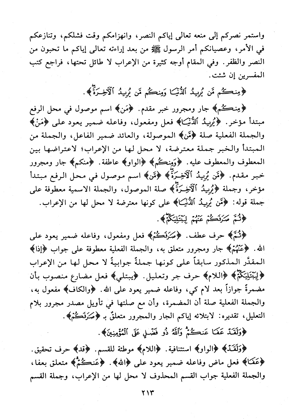 {مِنْكُمْ} جار ومجرور خبر مقدم. {مَنْ} اسم موصول في محل الرفع مبتدأ مؤخر. {يُرِيدُ الدُّنْيَا} فعل ومفعول، وفاعله ضمير يعود على {مَنْ} والجملة الفعلية صلة {مَنْ} الموصولة، والعائد ضمير الفاعل، والجملة من المبتدأ والخبر جملة معترضة، لا محل لها من الإعراب؛ لاعتراضها بين المعطوف والمعطوف عليه. {وَمِنْكُمْ} {الواو} عاطفة. {منكم} جار ومجرور خبر مقدم. {مَنْ يُرِيدُ الْآخِرَةَ} {مَنْ} اسم موصول في محل الرفع مبتدأ مؤخر، وجملة {يُرِيدُ الْآخِرَةَ} صلة الموصول، والجملة الإسمية معطوفة على جملة قوله: {مَنْ يُرِيدُ الْآخِرَةَ} على كونها معترضة لا محل لها من الإعراب.