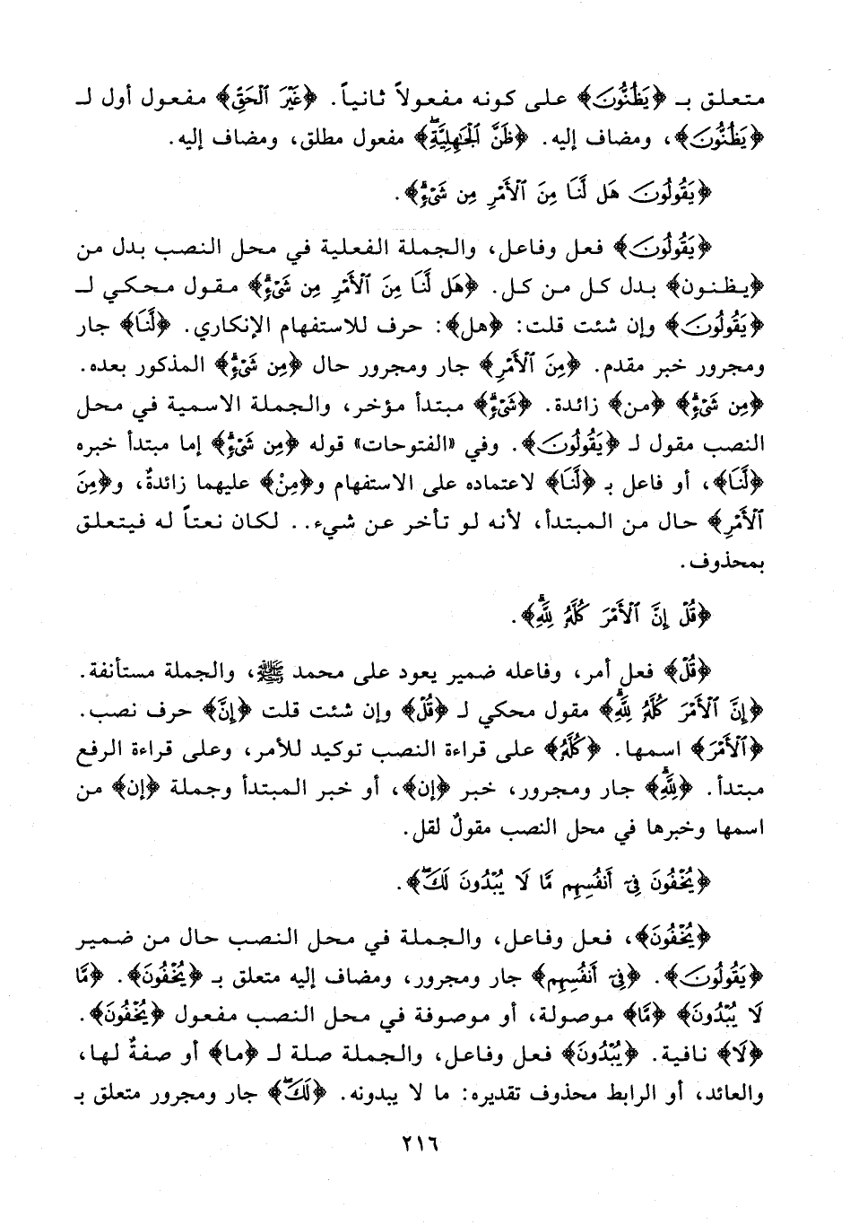 {يَقُولُونَ} فعل وفاعل، والجملة الفعلية في محل النصب بدل من {يَظُنُّونَ} بدل كل من كل. {هَلْ لَنَا مِنَ الْأَمْرِ مِنْ شَيْءٍ} مقول محكي لـ {يَقُولُونَ} وإن شئت قلت: {هل}: حرف للاستفهام الإنكاري. {لَنَا} جار ومجرور خبر مقدم. {مِنَ الْأَمْرِ} جار ومجرور حال {مِنْ شَيْءٍ} المذكور بعده. {مِنْ شَيْءٍ} {من} زائدة. {شَيْءٍ} مبتدأ مؤخر، والجملة الإسمية في محل النصب مقول لـ {يَقُولُونَ}. وفي "الفتوحات" قوله {مِنْ شَيْءٍ} إما مبتدأ خبره {لَنَا}، أو فاعل بـ {لَنَا} لاعتماده على الاستفهام و {مِن} عليهما زائدةٌ، و {مِنَ الْأَمْرِ} حال من المبتدأ، لأنه لو تأخر عن شيء .. لكان نعتًا له فيتعلق بمحذوف.