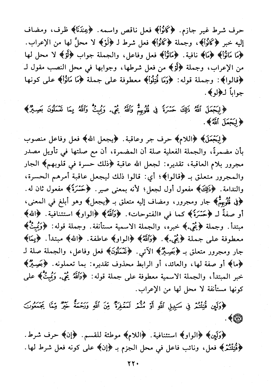 {لِيَجْعَلَ} {اللام} حرف جر وعاقبة. {يجعل الله} فعل وفاعل منصوب بأن مضمرةً، والجملة الفعلية صلة أن المضمرة، أن مع صلتها في تأويل مصدر مجرور بلام العاقبة، تقديره: لجعل الله عاقبة {ذلك حسرة في قلوبهم} الجار والمجرور متعلق بـ {قالوا}؛ أي: قالوا ذلك ليجعل عاقبة أمرهم الحسرة، والندامة. {ذَلِكَ} مفعول أول لجعل؛ لأنه بمعنى صير. {حَسْرَةً} مفعول ثان له. {فِي قُلُوبِهِمْ} جار ومجرور، ومضاف إليه متعلق بـ {يجعل} وهو أبلغ في المعنى، أو صفة لـ {حَسْرَةً} كما في "الفتوحات". {وَاللَّهُ} {الواو} استئنافية. {الله} مبتدأ. وجملة {يُحْيِي} خبره، والجملة الإسمية مستأنفة. وجملة قوله: {وَيُمِيتُ} معطوفة على جملة {يُحْيِي}. {وَاللَّهُ} {الواو} عاطفة. {الله} مبتدأ. {بِمَا} جار ومجرور متعلق بـ {بَصِيرٌ} الآتي. {تَعْمَلُونَ} فعل وفاعل، والجملة صلة لـ {ما} أو صفة لها، والعائد، أو الرابط محذوف تقديره: بما تعملونه. {بَصِيرٌ} خبر المبتدأ، والجملة الإسمية معطوفة على جملة قوله: {وَاللَّهُ يُحْيِي وَيُمِيتُ} على كونها مستأنفة لا محل لها من الإعراب.
