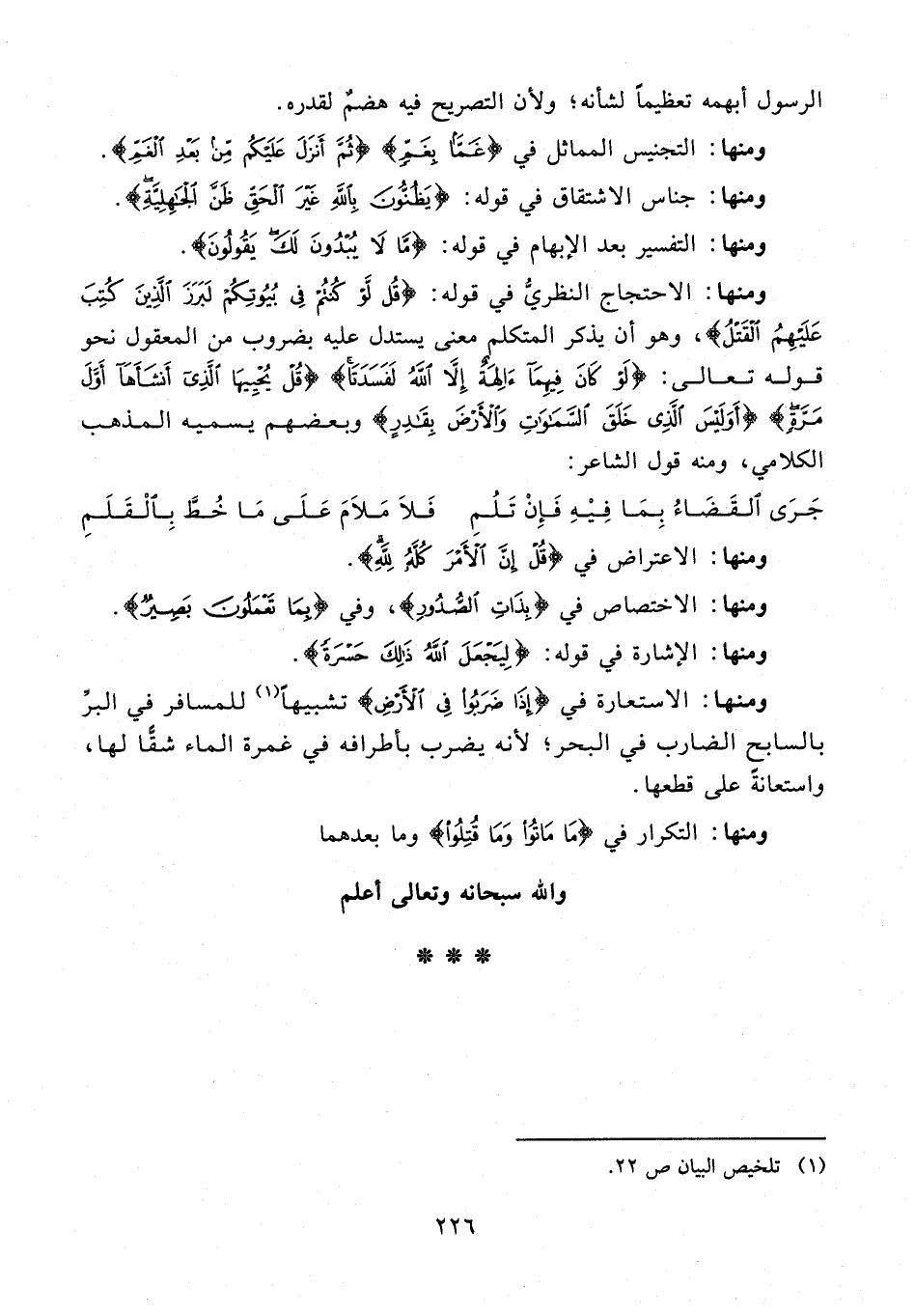 ومنها: الاحتجاج النظريُّ في قوله: {قُلْ لَوْ كُنْتُمْ فِي بُيُوتِكُمْ لَبَرَزَ الَّذِينَ كُتِبَ عَلَيْهِمُ الْقَتْلُ}، وهو أن يذكر المتكلم معنى يستدل عليه بضروب من المعقول نحو قوله تعالى: {لَوْ كَانَ فِيهِمَا آلِهَةٌ إِلَّا اللَّهُ لَفَسَدَتَا} {قُلْ يُحْيِيهَا الَّذِي أَنْشَأَهَا أَوَّلَ مَرَّةٍ} {أَوَلَيْسَ الَّذِي خَلَقَ السَّمَاوَاتِ وَالْأَرْضَ بِقَادِرٍ} وبعضهم يسميه المذهب الكلامي، ومنه قول الشاعر: