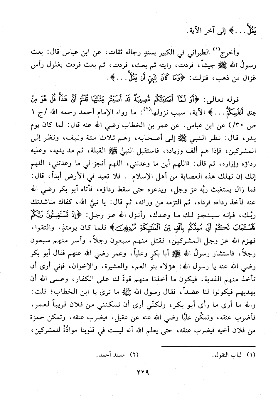 قوله تعالى: {أَوَلَمَّا أَصَابَتْكُمْ مُصِيبَةٌ قَدْ أَصَبْتُمْ مِثْلَيْهَا قُلْتُمْ أَنَّى هَذَا قُلْ هُوَ مِنْ عِنْدِ أَنْفُسِكُمْ ...} الآية، سبب نزولها (¬2): ما رواه الإِمام أحمد رحمه الله/ ج1 ص 30/) عن ابن عباس، عن عمر بن الخطاب رضي الله عنه قال: لما كان يوم بدر، قال: نظر النبي - صلى الله عليه وسلم - إلى أصحابه، وهم ثلاث مئة ونيف، ونظر إلى المشركين، فإذا هم ألف وزيادة، فاستقبل النبيُّ - صلى الله عليه وسلم - القبلة، ثم مد يديه، وعليه رداؤه وإزاره، ثم قال: "اللهم أين ما وعدتني، اللهم أنجز لي ما وعدتني، اللهم إنك إن تهلك هذه العصابة من أهل الإِسلام .. فلا تعبد في الأرض أبدًا، قال: فما زال يستغيث ربَّه عَزَّ وَجَلَّ، ويدعوه حتى سقط رداؤه، فأتاه أبو بكر رضي الله عنه فأخذ رداءه فرداه، ثم التزمه من ورائه، ثم قال: يا نبيَّ الله، كفاك مناشدتك ربَّك، فإنه سينجز لك ما وعدك، وأنزل الله عَزَّ وَجَلَّ: {إِذْ تَسْتَغِيثُونَ رَبَّكُمْ فَاسْتَجَابَ لَكُمْ أَنِّي مُمِدُّكُمْ بِأَلْفٍ مِنَ الْمَلَائِكَةِ مُرْدِفِينَ} فلما كان يومئذٍ، والتقوا، فهزم الله عَزَّ وَجَلَّ المشركين، فقتل منهم سبعون رجلًا، وأسر منهم سبعون رجلًا، فاستشار رسولُ الله - صلى الله عليه وسلم - أبا بكرٍ وعليًّا، وعمر رضي الله عنهم فقال أبو بكر رضي الله عنه يا رسول الله: هؤلاء بنو العم، والعشيرة، والإخوان، فإني أرى أن تأخذ منهم الفدية، فيكون ما أخذنا منهم قوةً لنا على الكفار، وعسى الله أن يهديهم فيكونوا لنا عضدًا، فقال رسول الله - صلى الله عليه وسلم - ما ترى يا ابن الخطاب؛ قلت: والله ما أرى ما رأى أبو بكر، ولكنّي أرى أن تمكنني من فلان قريبًا لعمر، فأضرب عنقه، وتمكِّن عليًّا رضي الله عنه عن عقيل، فيضرب عنقه، وتمكن حمزة من فلان أخيه فيضرب عنقه، حتى يعلم الله أنه ليست في قلوبنا موادَّةٌ للمشركين،
