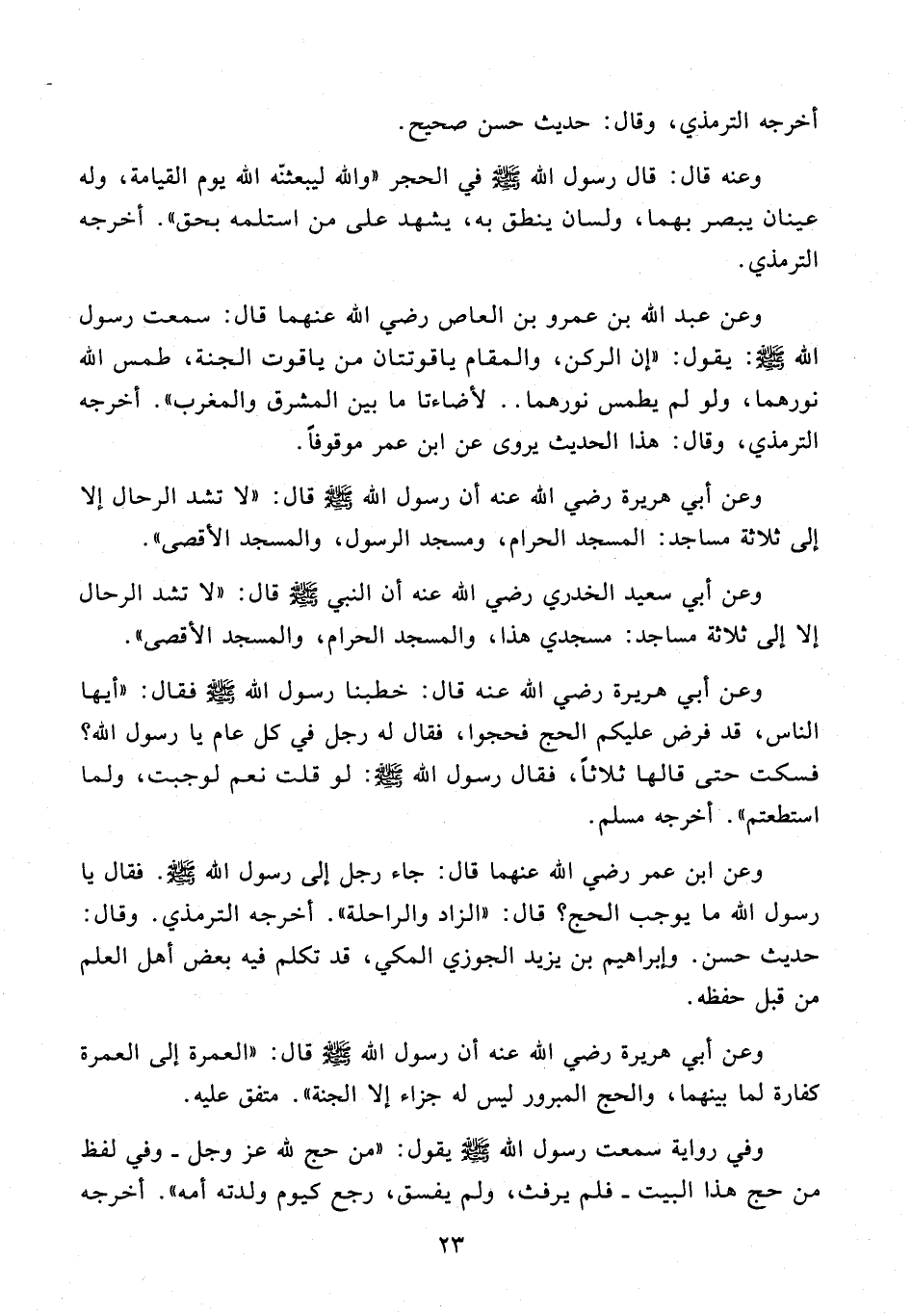 وعنه قال: قال رسول الله - صلى الله عليه وسلم - في الحجر "والله ليبعثنّه الله يوم القيامة، وله عينان يبصر بهما، ولسان ينطق به، يشهد على من استلمه بحق". أخرجه الترمذي.