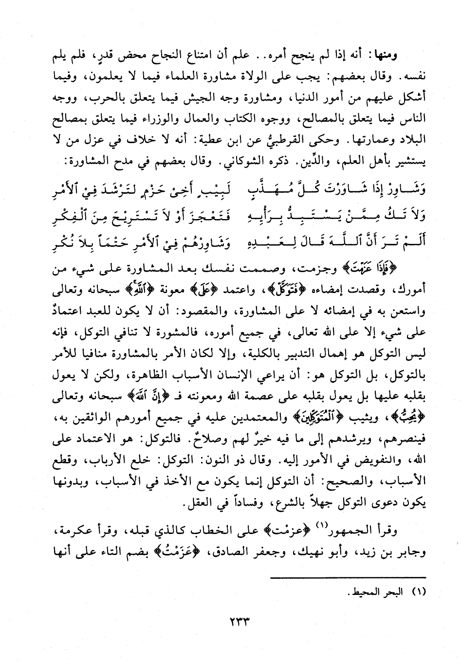 ومنها: أنه إذا لم ينجح أمره .. علم أن امتناع النجاح محض قدرٍ، فلم يلم نفسه. وقال بعضهم: يجب على الولاة مشاورة العلماء فيما لا يعلمون، وفيما أشكل عليهم من أمور الدنيا، ومشاورة وجه الجيش فيما يتعلق بالحرب، ووجه الناس فيما يتعلق بالمصالح، ووجوه الكتاب والعمال والوزراء فيما يتعلق بمصالح البلاد وعمارتها. وحكى القرطبيُّ عن ابن عطية: أنه لا خلاف في عزل من لا يستشير بأهل العلم، والدِّين. ذكره الشوكاني. وقال بعضهم في مدح المشاورة: