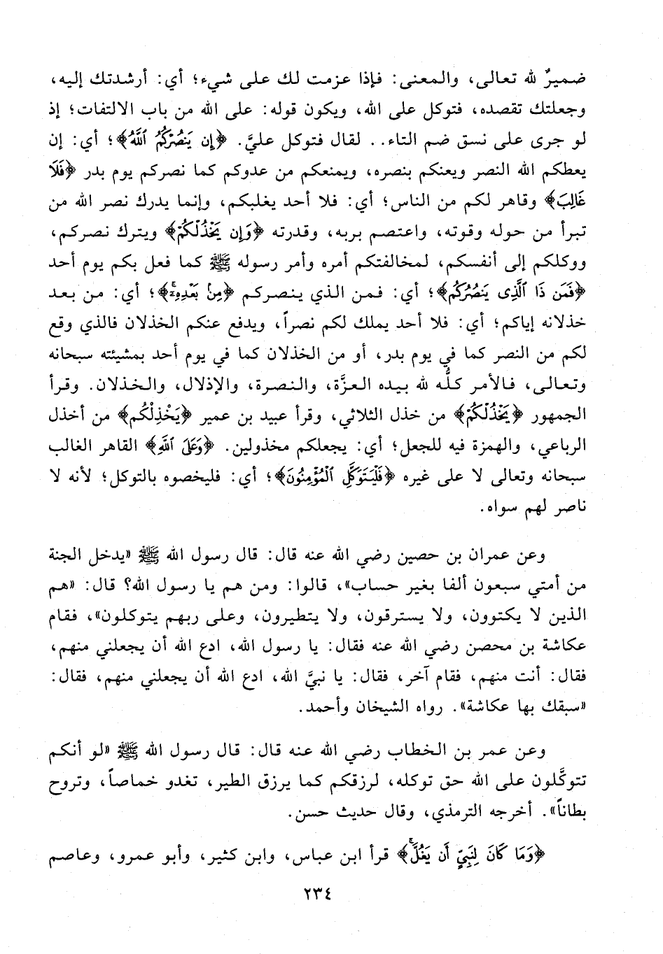 160 - {إِنْ يَنْصُرْكُمُ اللَّهُ}؛ أي: إن يعطكم الله النصر ويعنكم بنصره، ويمنعكم من عدوكم كما نصركم يوم بدر {فَلَا غَالِبَ} وقاهر لكم من الناس؛ أي: فلا أحد يغلبكم، وإنما يدرك نصر الله من تبرأ من حوله وقوته، واعتصم بربه، وقدرته {وَإِنْ يَخْذُلْكُمْ} ويترك نصركم، ووكلكم إلى أنفسكم، لمخالفتكم أمره وأمر رسوله - صلى الله عليه وسلم - كما فعل بكم يوم أحد {فَمَنْ ذَا الَّذِي يَنْصُرُكُمْ}؛ أي: فمن الذي ينصركم {مِنْ بَعْدِهِ}؛ أي: من بعد خذلانه إياكم؛ أي: فلا أحد يملك لكم نصرًا، ويدفع عنكم الخذلان فالذي وقع لكم من النصر كما في يوم بدر، أو من الخذلان كما في يوم أحد بمشيئته سبحانه وتعالى، فالأمر كلُّه لله بيده العزَّة، والنصرة، والإذلال، والخذلان. وقرأ الجمهور {يَخْذُلْكُمْ} من خذل الثلاثي، وقرأ عبيد بن عمير {يَخْذُلْكُمْ} من أخذل الرباعي، والهمزة فيه للجعل؛ أي: يجعلكم مخذولين. {وَعَلَى اللَّهِ} القاهر الغالب سبحانه وتعالى لا على غيره {فَلْيَتَوَكَّلِ الْمُؤْمِنُونَ}؛ أي: فليخصوه بالتوكل؛ لأنه لا ناصر لهم سواه.