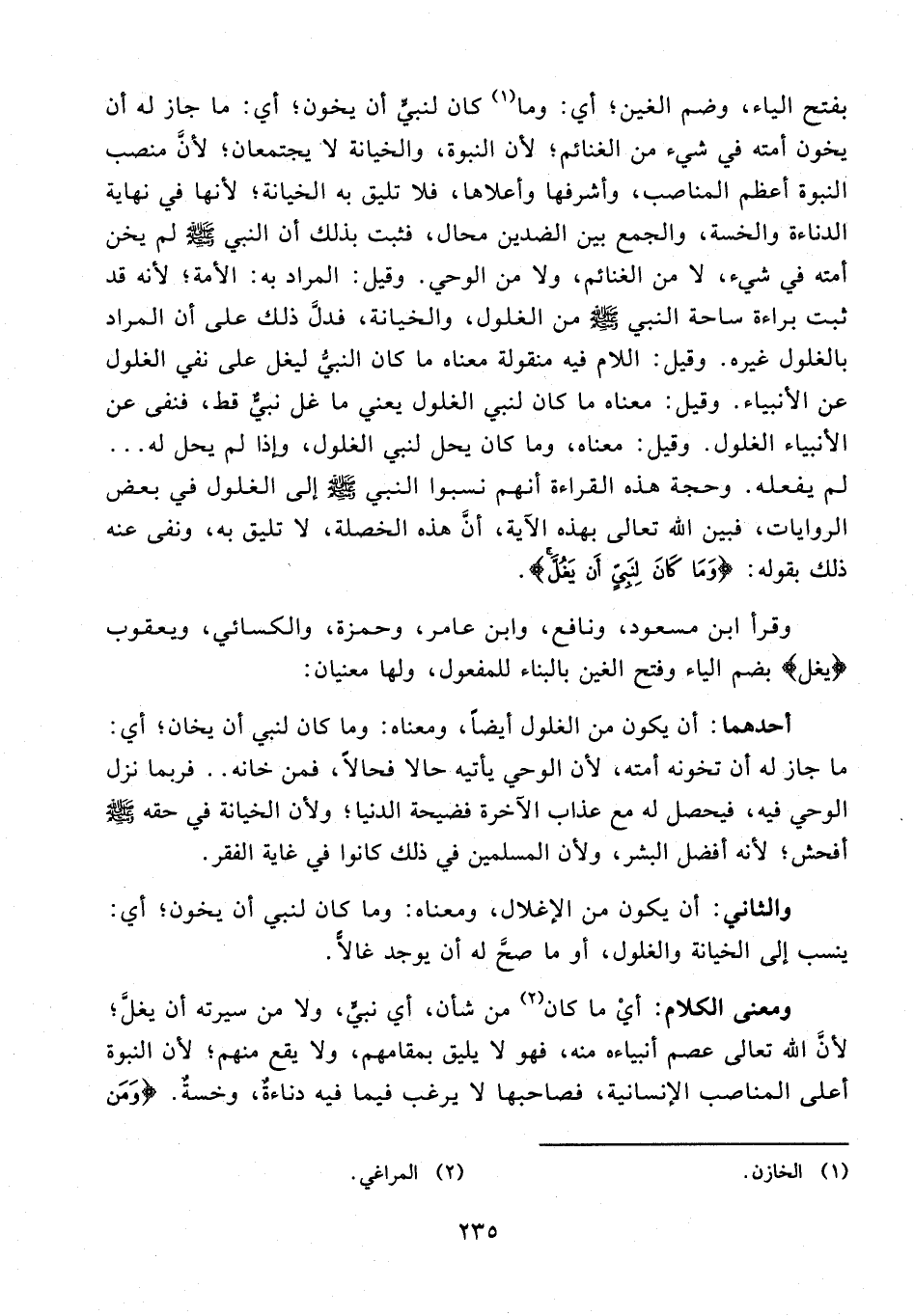 بفتح الياء، وضم الغين؛ أي: وما (¬1) كان لنبيٍّ أن يخون؛ أي: ما جاز له أن يخون أمته في شيء من الغنائم؛ لأن النبوة، والخيانة لا يجتمعان؛ لأنَّ منصب النبوة أعظم المناصب، وأشرفها وأعلاها، فلا تليق به الخيانة؛ لأنها في نهاية الدناءة والخسة، والجمع بين الضدين محال، فثبت بذلك أن النبي - صلى الله عليه وسلم - لم يخن أمته في شيء، لا من الغنائم، ولا من الوحي. وقيل: المراد به: الأمة؛ لأنه قد ثبت براءة ساحة النبي - صلى الله عليه وسلم - من الغلول، والخيانة، فدلَّ ذلك على أن المراد بالغلول غيره. وقيل: اللام فيه منقولة معناه ما كان النبيُّ ليغل على نفي الغلول عن الأنبياء. وقيل: معناه ما كان لنبي الغلول يعني ما غل نبيٌّ قط، فنفى عن الأنبياء الغلول. وقيل: معناه، وما كان يحل لنبي الغلول، وإذا لم يحل له ... لم يفعله. وحجة هذه القراءة أنهم نسبوا النبي - صلى الله عليه وسلم - إلى الغلول في بعض الروايات، فبين الله تعالى بهذه الآية، أنَّ هذه الخصلة، لا تليق به، ونفى عنه ذلك بقوله: {وَمَا كَانَ لِنَبِيٍّ أَنْ يَغُلَّ}.