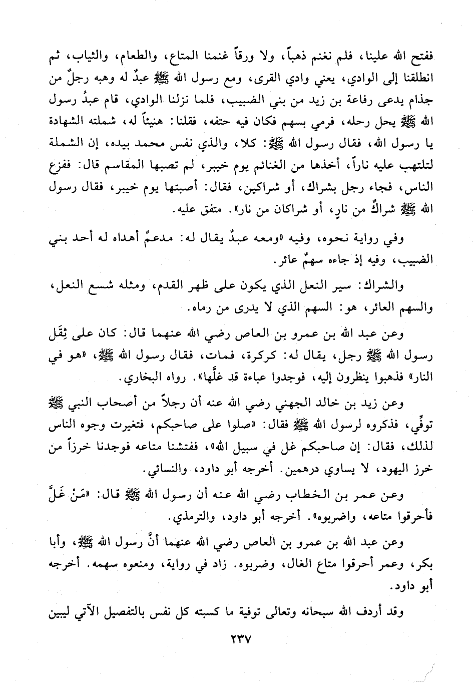 ففتح الله علينا، فلم نغنم ذهبًا، ولا ورقًا غنمنا المتاع، والطعام، والثياب، ثم انطلقنا إلى الوادي، يعني وادي القرى، ومع رسول الله - صلى الله عليه وسلم - عبدٌ له وهبه رجلٌ من جذام يدعى رفاعة بن زيد من بني الضبيب، فلما نزلنا الوادي، قام عبدُ رسول الله - صلى الله عليه وسلم - يحل رحله، فرمي بسهم فكان فيه حتفه، فقلنا: هنيئًا له، شملته الشهادة يا رسول الله، فقال رسول الله - صلى الله عليه وسلم -: كلا، والذي نفس محمَّد بيده، إن الشملة لتلتهب عليه نارًا، أخذها من الغنائم يوم خيبر، لم تصبها المقاسم قال: ففزع الناس، فجاء رجل بشراك، أو شراكين، فقال: أصبتها يوم خيبر، فقال رسول الله - صلى الله عليه وسلم - شراكٌ من نارٍ، أو شراكان من نار". متفق عليه.