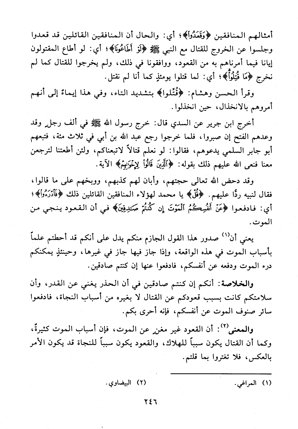 والمعنى (¬2): أن القعود غير مغنٍ عن الموت، فإن أسباب الموت كثيرةٌ، وكما أن القتال يكون سببًا للهلاك، والقعود يكون سببًا للنجاة قد يكون الأمر بالعكس، فلا تغتروا بما قلتم.