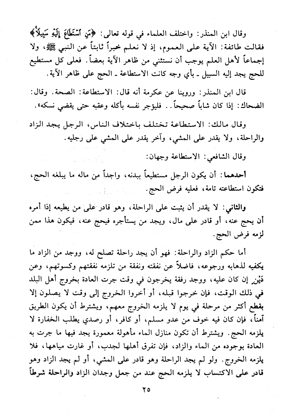 قال ابن المنذر: وروينا عن عكرمة أنه قال: الاستطاعة: الصحة. وقال: الضحاك: إذا كان شابًّا صحيحًا .. فليؤجر نفسه بأكله وعقبه حتى يقضي نسكه".