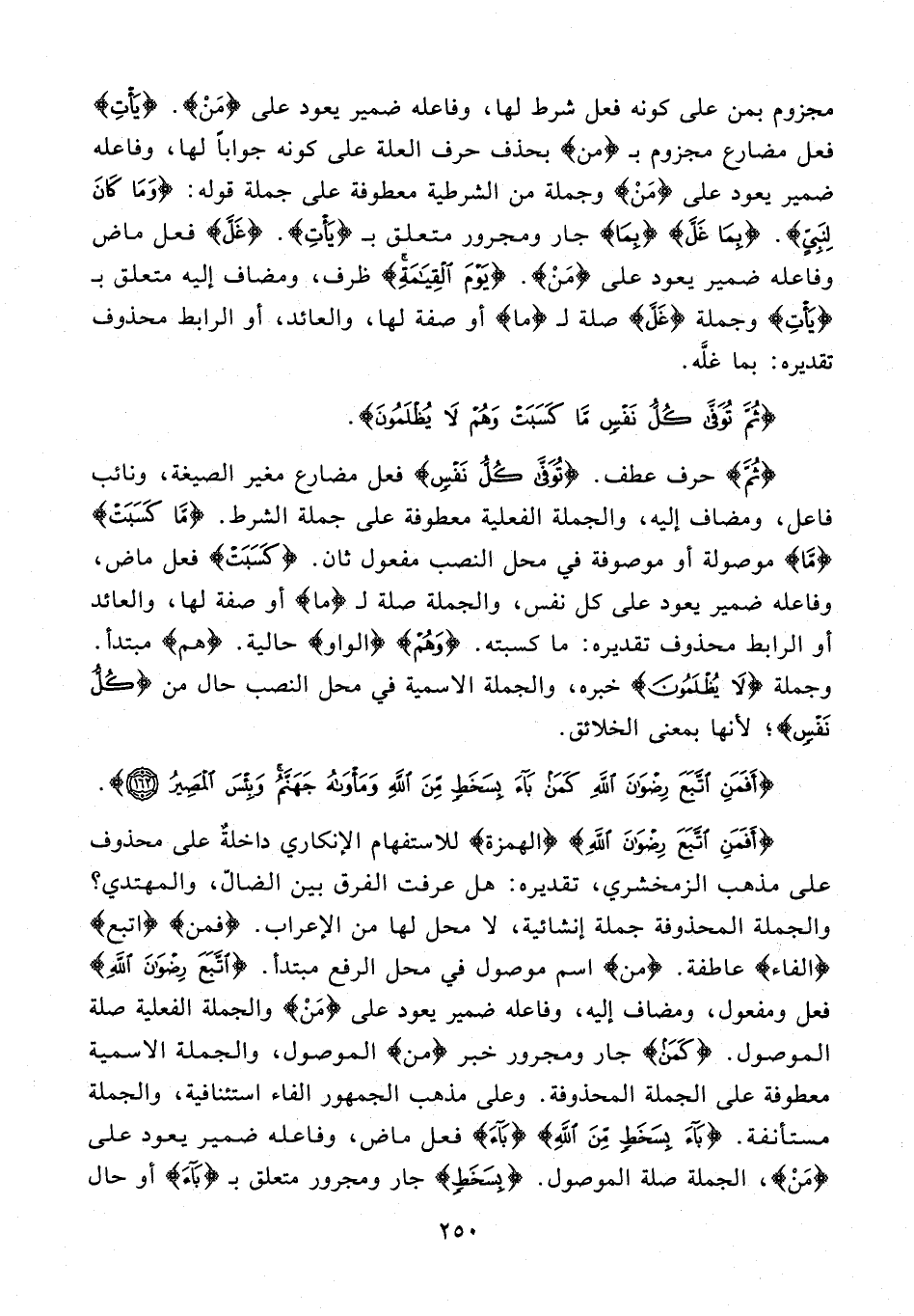 {أَفَمَنِ اتَّبَعَ رِضْوَانَ اللَّهِ} {الهمزة} للاستفهام الإنكاري داخلةٌ على محذوف على مذهب الزمخشري، تقديره: هل عرفت الفرق بين الضالّ، والمهتدي؟ والجملة المحذوفة جملة إنشائية، لا محل لها من الإعراب. {فَمَنِ} {اتَّبَعَ} {الفاء} عاطفة. {مَنِ} اسم موصول في محل الرفع مبتدأ. {اتَّبَعَ رِضْوَانَ اللَّهِ} فعل ومفعول، ومضاف إليه، وفاعله ضمير يعود على {مَنْ} والجملة الفعلية صلة الموصول. {كَمَنْ} جار ومجرور خبر {مَنِ} الموصول، والجملة الإسمية معطوفة على الجملة المحذوفة. وعلى مذهب الجمهور الفاء استئنافية، والجملة مستأنفة. {بَاءَ بِسَخَطٍ مِنَ اللَّهِ} {بَاءَ} فعل ماض، وفاعله ضمير يعود على {مَنْ}، الجملة صلة الموصول. {بِسَخَطٍ} جار ومجرور متعلق بـ {بَاءَ} أو حال