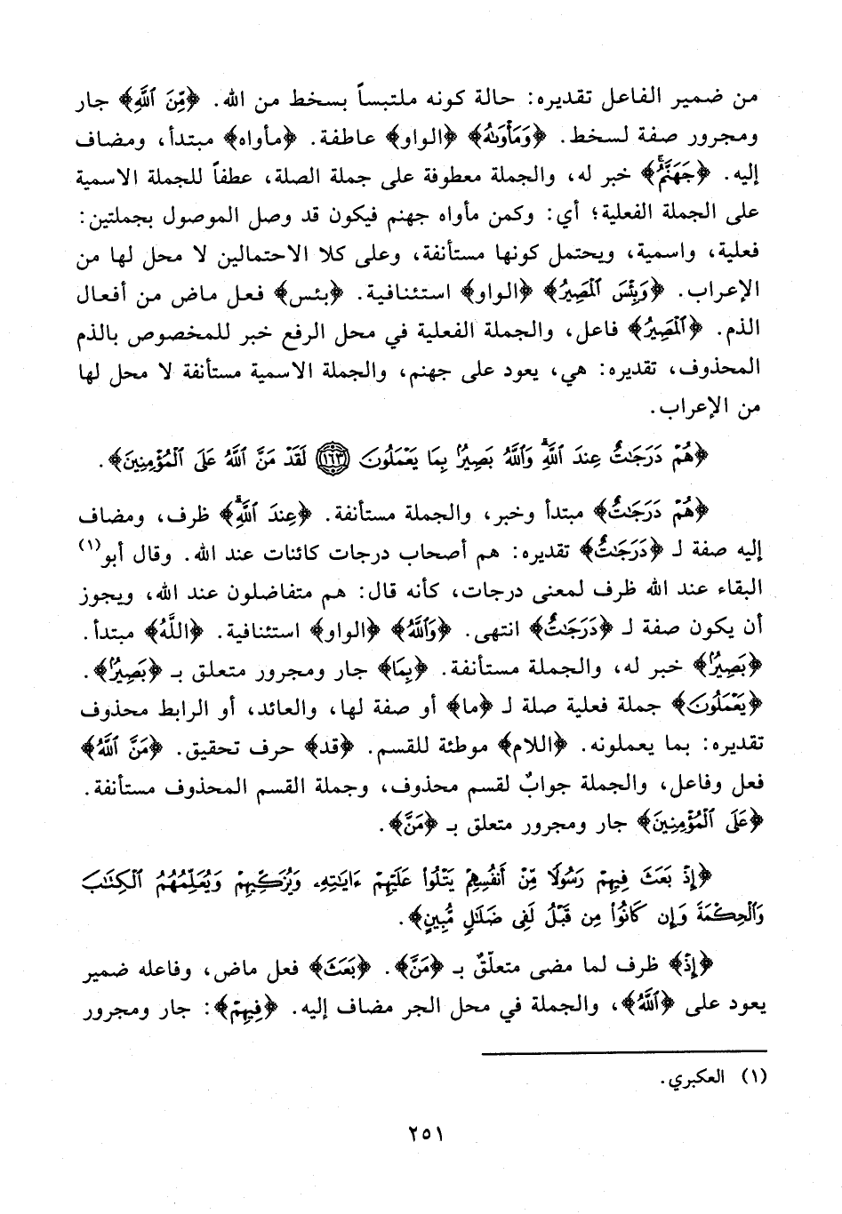 {هُمْ دَرَجَاتٌ} مبتدأ وخبر، والجملة مستأنفة. {عِنْدَ اللَّهِ} ظرف، ومضاف إليه صفة لـ {دَرَجَاتٌ} تقديره: هم أصحاب درجات كائنات عند الله. وقال أبو (¬1) البقاء عند الله ظرف لمعنى درجات، كأنه قال: هم متفاضلون عند الله، ويجوز أن يكون صفة لـ {دَرَجَاتٌ} انتهى. {وَاللَّهُ} {الواو} استئنافية. {اللَّهُ} مبتدأ. {بَصِيرٌ} خبر له، والجملة مستأنفة. {بِمَا} جار ومجرور متعلق بـ {بَصِيرٌ}. {يَعْمَلُونَ} جملة فعلية صلة لـ {مَا} أو صفة لها، والعائد، أو الرابط محذوف تقديره: بما يعملونه. {اللام} موطئة للقسم. {قد} حرف تحقيق. {مَنَّ اللَّهُ} فعل وفاعل، والجملة جوابٌ لقسم محذوف، وجملة القسم المحذوف مستأنفة. {عَلَى الْمُؤْمِنِينَ} جار ومجرور متعلق بـ {مَنَّ}.