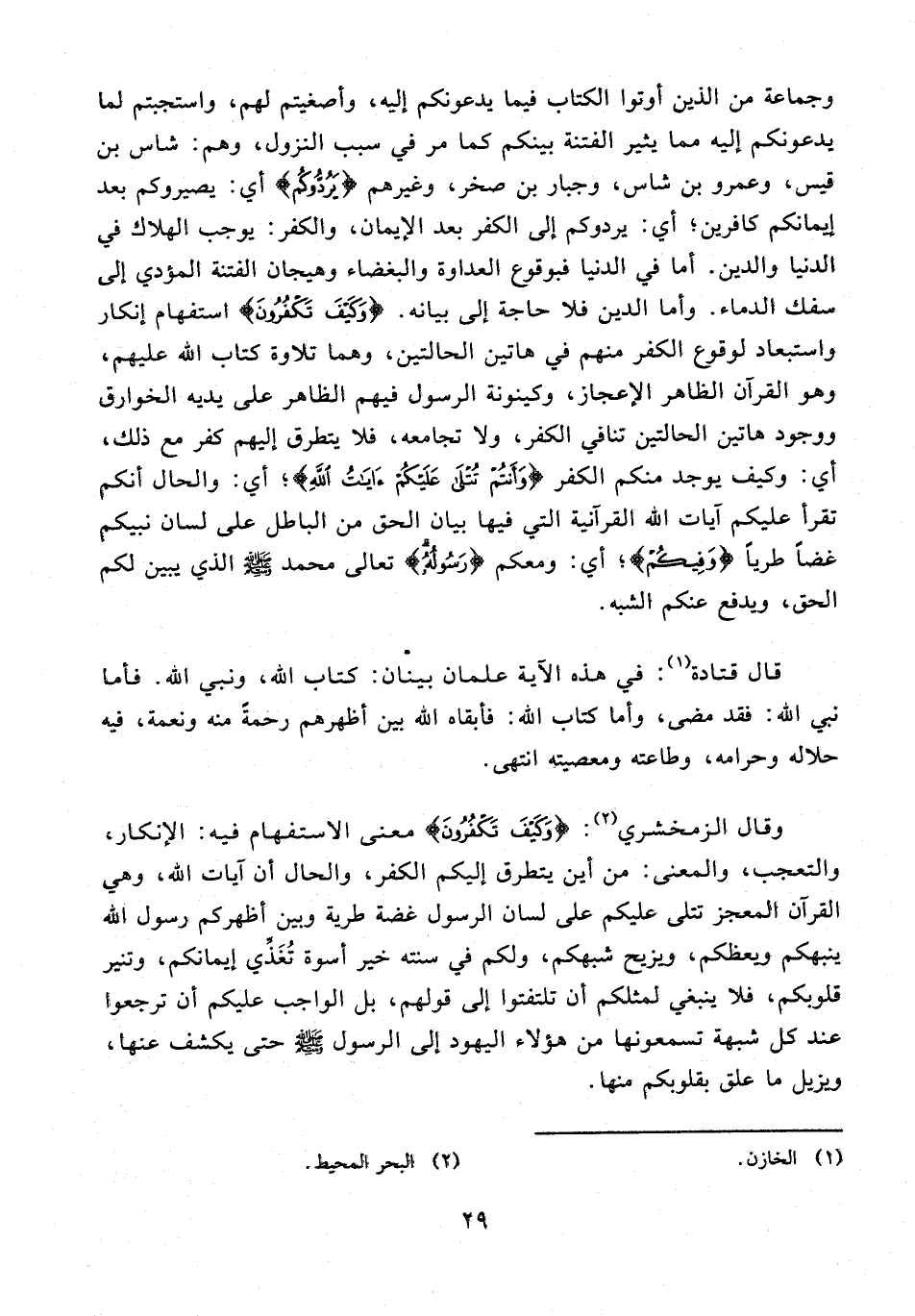 وقال الزمخشري (¬2): {وَكَيْفَ تَكْفُرُونَ} معنى الاستفهام فيه: الإنكار، والتعجب، والمعنى: من أين يتطرق إليكم الكفر، والحال أن آيات الله، وهي القرآن المعجز تتلى عليكم على لسان الرسول غضة طرية وبين أظهركم رسول الله ينبهكم ويعظكم، ويزيح شبهكم، ولكم في سنته خير أسوة تُغَذِّي إيمانكم، وتنير قلوبكم، فلا ينبغي لمثلكم أن تلتفتوا إلى قولهم، بل الواجب عليكم أن ترجعوا عند كل شبهة تسمعونها من هؤلاء اليهود إلى الرسول - صلى الله عليه وسلم - حتى يكشف عنها، ويزيل ما علق بقلوبكم منها.