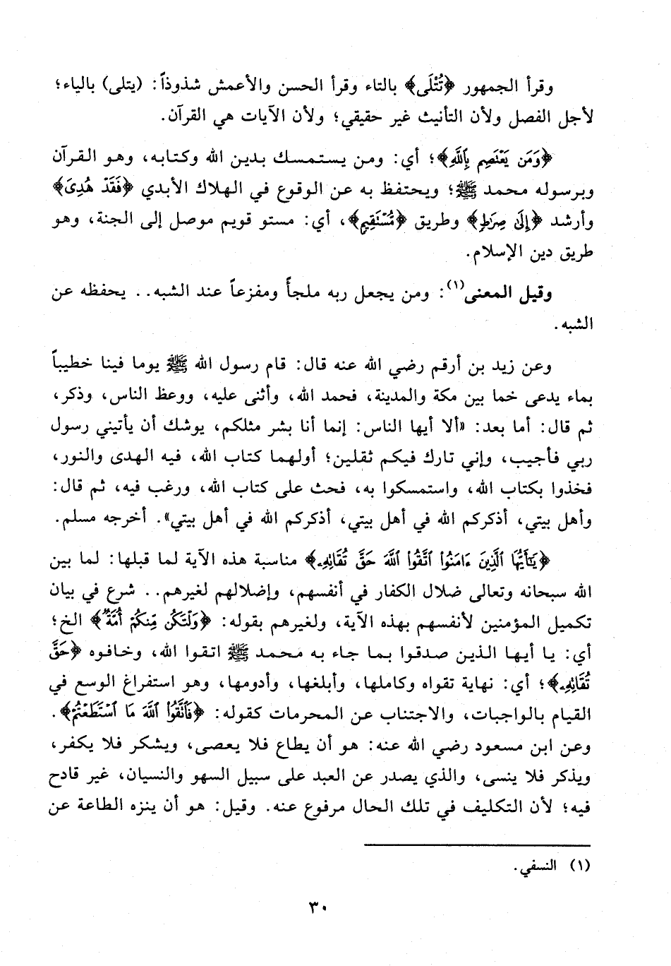 وعن زيد بن أرقم رضي الله عنه قال: قام رسول الله - صلى الله عليه وسلم - يوما فينا خطيبًا بماء يدعى خما بين مكة والمدينة، فحمد الله، وأثنى عليه، ووعظ الناس، وذكر، ثم قال: أما بعد: "ألا أيها الناس: إنما أنا بشر مثلكم، يوشك أن يأتيني رسول ربي فأجيب، وإني تارك فيكم ثقلين؛ أولهما كتاب الله، فيه الهدى والنور، فخذوا بكتاب الله، واستمسكوا به، فحث على كتاب الله، ورغب فيه، ثم قال: وأهل بيتي، أذكركم الله في أهل بيتي، أذكركم الله في أهل بيتي". أخرجه مسلم.