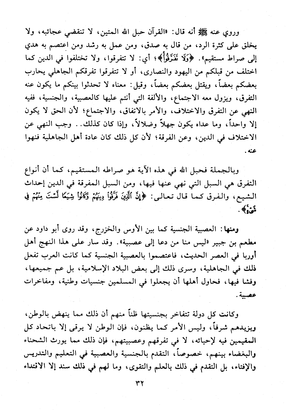وكانت كل دولة تتفاخر بجنسيتها ظنًّا منهم أن ذلك مما ينهض بالوطن، ويزيدهم شرفًا، وليس الأمر كما يظنون، فإن الوطن لا يرقى إلا باتحاد كل المقيمين فيه لإحيائه، لا في تفرقهم وعصبيتهم، فإن ذلك مما يورث الشحناء والبغضاء بينهم، خصوصًا، التقدم بالجنسية والعصبية في التعليم والتدريس والإفتاء، بل التقدم في ذلك بالعلم والتقوى، وما لهم في ذلك سند إلا الاقتداء