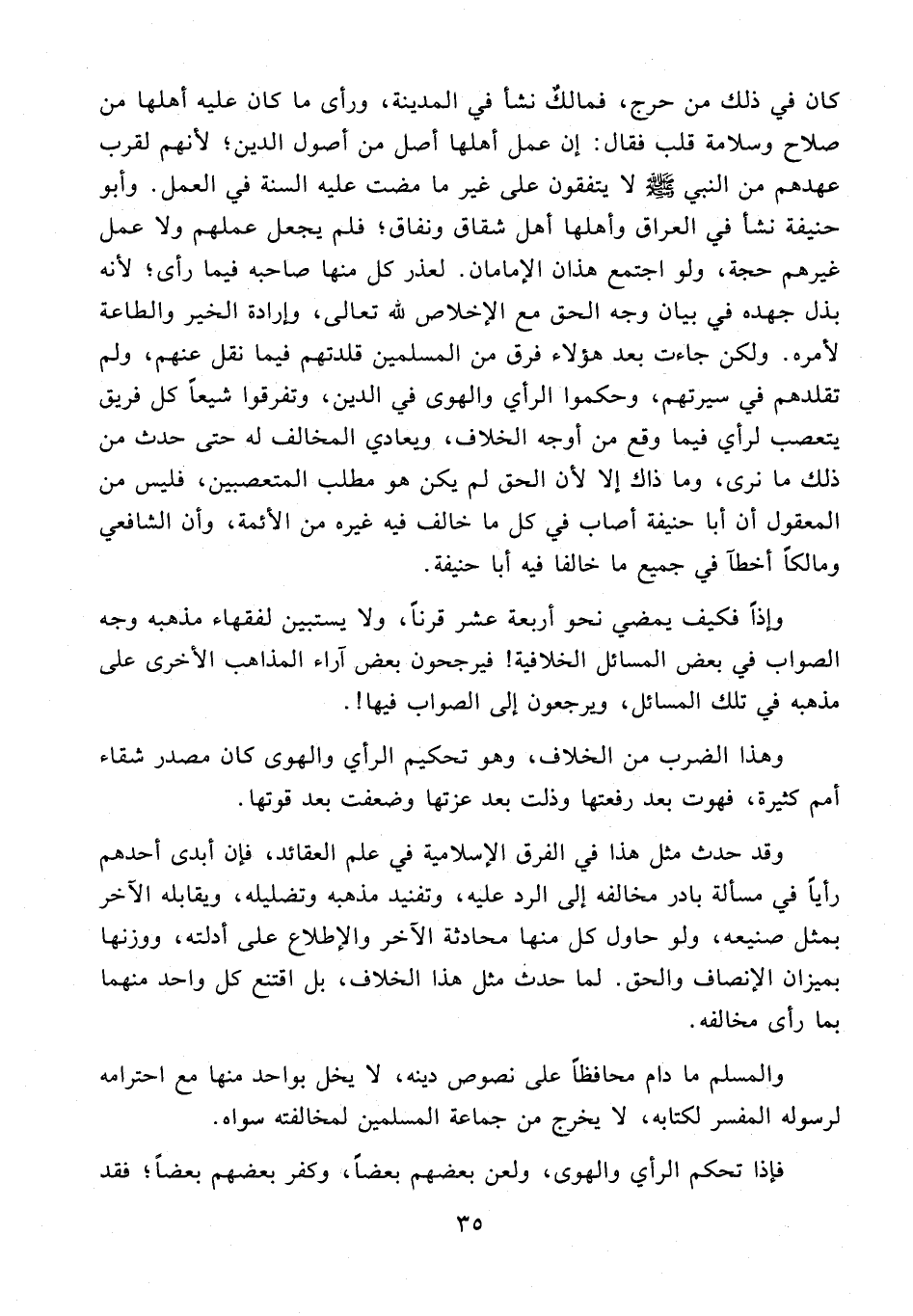 كان في ذلك من حرج، فمالكٌ نشأ في المدينة، ورأى ما كان عليه أهلها من صلاح وسلامة قلب فقال: إن عمل أهلها أصل من أصول الدين؛ لأنهم لقرب عهدهم من النبي - صلى الله عليه وسلم - لا يتفقون على غير ما مضت عليه السنة في العمل. وأبو حنيفة نشأ في العراق وأهلها أهل شقاق ونفاق؛ فلم يجعل عملهم ولا عمل غيرهم حجة، ولو اجتمع هذان الإمامان. لعذر كل منها صاحبه فيما رأى؛ لأنه بذل جهده في بيان وجه الحق مع الإخلاص لله تعالى، وإرادة الخير والطاعة لأمره. ولكن جاءت بعد هؤلاء فرق من المسلمين قلدتهم فيما نقل عنهم، ولم تقلدهم في سيرتهم، وحكموا الرأي والهوى في الدين، وتفرقوا شيعًا كل فريق يتعصب لرأي فيما وقع من أوجه الخلاف، ويعادي المخالف له حتى حدث من ذلك ما نرى، وما ذاك إلا لأن الحق لم يكن هو مطلب المتعصبين، فليس من المعقول أن أبا حنيفة أصاب في كل ما خالف فيه غيره من الأئمة، وأن الشافعي ومالكًا أخطآ في جميع ما خالفا فيه أبا حنيفة.