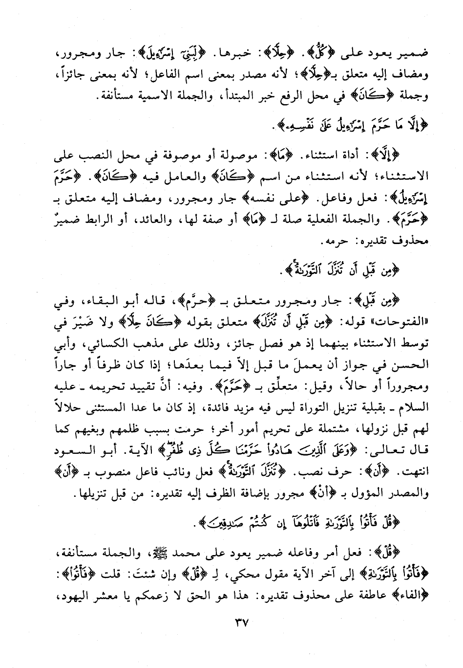 {إِلَّا}: أداة استثناء. {مَا}: موصولة أو موصوفة في محل النصب على الاستثناء؛ لأنه استثناء من اسم {كَانَ} والعامل فيه {كَانَ}. {حَرَّمَ إِسْرَائِيلُ}: فعل وفاعل. {عَلَى نَفْسِهِ} جار ومجرور، ومضاف إليه متعلق بـ {حَرَّمَ}. والجملة الفعلية صلة لـ {مَا} أو صفة لها، والعائد، أو الرابط ضميرٌ محذوف تقديره: حرمه.