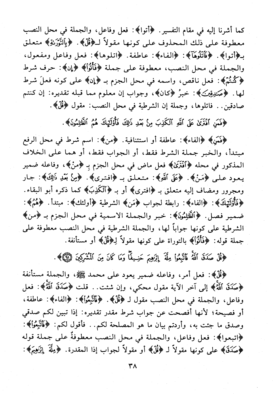كما أشرنا إليه في مقام التفسير. {أتُوا}: فعل وفاعل، والجملة في محل النصب معطوفة على ذلك المحذوف على كونها مقولًا لـ {قُلْ}. {بِالتَّوْرَاةِ} متعلق بـ {أتوا}. {فَاتْلُوهَا}: {الفاء}: عاطفة. {اتلوها}: فعل وفاعل ومفعول، والجملة في محل النصب، معطوفة على جملة {فَأْتُوا} {إِنْ}: حرف شرط {كُنْتُمْ}: فعل ناقص، واسمه في محل الجزم بـ {إِنْ} على كونه فعلَ شرط لها. {صَادِقِينَ}: خبرُ {كَانَ}، وجواب إن معلوم مما قبله تقديره: إن كنتم صادقين .. فاتلوها، وجملة إن الشرطية في محل النصب: مقول {قُلْ}.