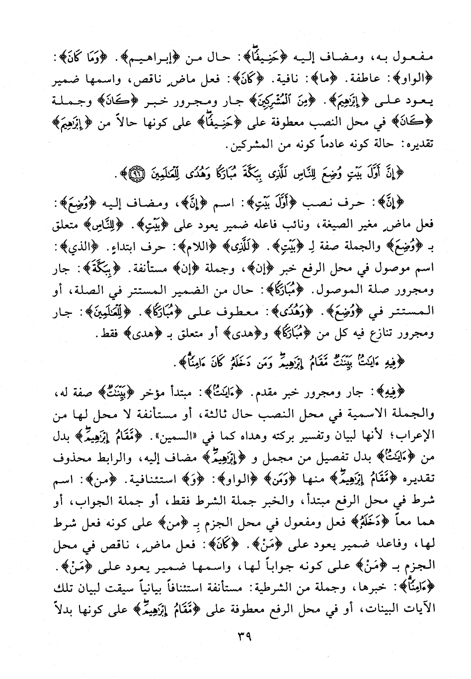 {فِيهِ}: جار ومجرور خبر مقدم. {آيَاتٌ}: مبتدأ مؤخر {بَيِّنَاتٌ} صفة له، والجملة الإسمية في محل النصب حال ثالثة، أو مستأنفة لا محل لها من الإعراب؛ لأنها لبيان وتفسير بركته وهداه كما في "السمين". {مَقَامُ إِبْرَاهِيمَ} بدل من {آيَاتٌ} بدل تفصيل من مجمل و {إِبْرَاهِيمَ} مضاف إليه، والرابط محذوف تقديره {مَقَامُ إِبْرَاهِيمَ} منها {وَمَنْ} {الواو}: {وَ} استئنافية. {من}: اسم شرط في محل الرفع مبتدأ، والخبر جملة الشرط فقط، أو جملة الجواب، أو هما معًا {دَخَلَهُ} فعل ومفعول في محل الجزم بِـ {من} على كونه فعل شرط لها، وفاعله ضمير يعود على {مَنْ}. {كَانَ}: فعل ماضٍ، ناقص في محل الجزم بـ {مَنْ} على كونه جوابًا لها، واسمها ضمير يعود على {مَنْ}. {آمِنًا}: خبرها، وجملة من الشرطية: مستأنفة استئنافًا بيانيًّا سيقت لبيان تلك الآيات البينات، أو في محل الرفع معطوفة على {مَقَامُ إِبْرَاهِيمَ} على كونها بدلًا