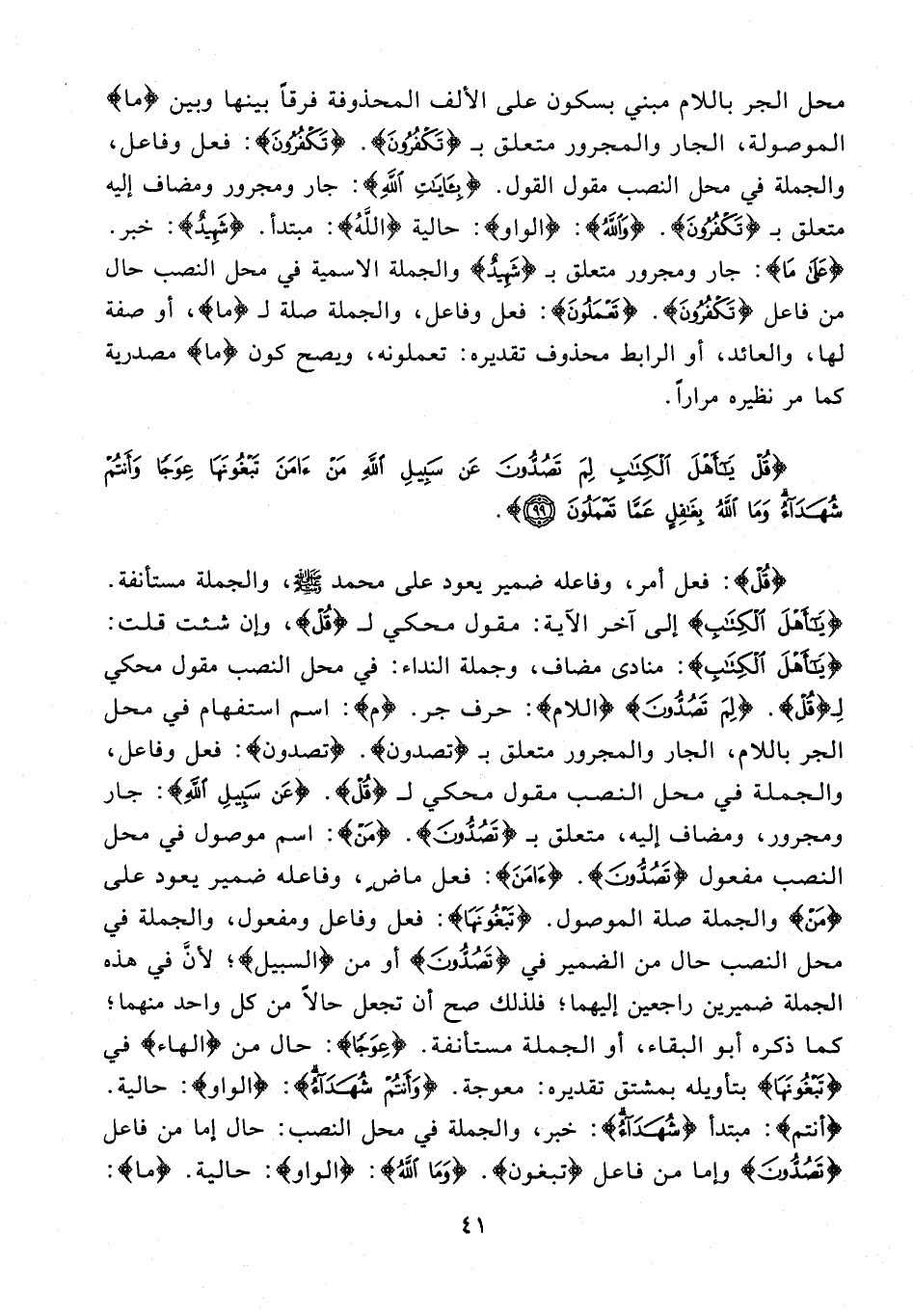 {قُلْ}: فعل أمر، وفاعله ضمير يعود على محمَّد - صلى الله عليه وسلم -، والجملة مستأنفة. {يَا أَهْلَ الْكِتَابِ} إلى آخر الآية: مقول محكي لـ {قُلْ}، وإن شئت قلت: {يَا أَهْلَ الْكِتَابِ}: منادى مضاف، وجملة النداء: في محل النصب مقول محكي لِـ {قُلْ}. {لِمَ تَصُدُّونَ} {اللام}: حرف جر. {م}: اسم استفهام في محل الجر باللام، الجار والمجرور متعلق بـ {تَصُدُّونَ}. {تَصُدُّونَ}: فعل وفاعل، والجملة في محل النصب مقول محكي لـ {قُلْ}. {عَنْ سَبِيلِ اللَّهِ}: جار ومجرور، ومضاف إليه، متعلق بـ {تَصُدُّونَ}. {مَنْ}: اسم موصول في محل النصب مفعول {تَصُدُّونَ}. {آمَنَ}: فعل ماضٍ، وفاعله ضمير يعود على {مَنْ} والجملة صلة الموصول. {تَبْغُونَهَا}: فعل وفاعل ومفعول، والجملة في محل النصب حال من الضمير في {تَصُدُّونَ} أو من {السبيل}؛ لأنَّ في هذه الجملة ضميرين راجعين إليهما؛ فلذلك صح أن تجعل حالًا من كل واحد منهما؛ كما ذكره أبو البقاء، أو الجملة مستأنفة. {عِوَجًا}: حال من {الهاء} في {تَبْغُونَهَا} بتأويله بمشتق تقديره: معوجة. {وَأَنْتُمْ شُهَدَاءُ}: {الواو}: حالية. {أَنْتُمْ}: مبتدأ {شُهَدَاءُ}: خبر، والجملة في محل النصب: حال إما من فاعل {تَصُدُّونَ} وإما من فاعل {تَبْغُونَ}. {وَمَا اللَّهُ}: {الواو}: حالية. {ما}: