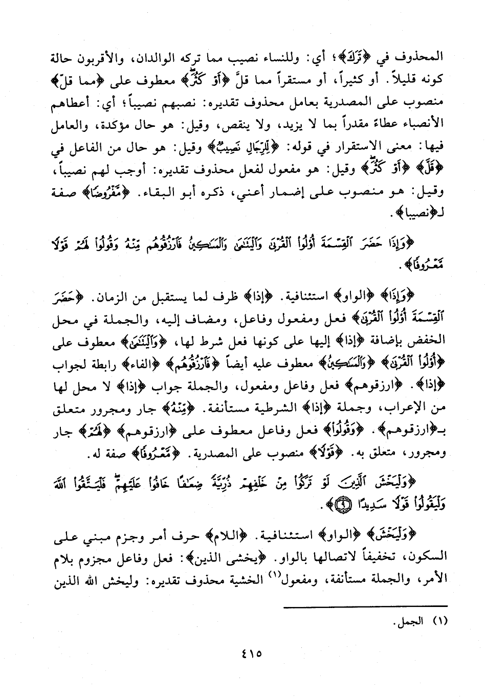 {وَإِذَا} {الواو} استئنافية. {إذا} ظرف لما يستقبل من الزمان. {حَضَرَ الْقِسْمَةَ أُولُو الْقُرْبَى} فعل ومفعول وفاعل، ومضاف إليه، والجملة في محل الخفض بإضافة {إذا} إليها على كونها فعل شرط لها، {وَالْيَتَامَى} معطوف على {أُولُو الْقُرْبَى} {وَالْمَسَاكِينُ} معطوف عليه أيضًا {فَارْزُقُوهُمْ} {الفاء} رابطة لجواب {إذا}. {ارزقوهم} فعل وفاعل ومفعول، والجملة جواب {إذا} لا محل لها من الإعراب، وجملة {إذا} الشرطية مستأنفة. {مِنْهُ} جار ومجرور متعلق بـ {ارزقوهم}. {وَقُولُوا} فعل وفاعل معطوف على {ارزقوهم} {لَهُمْ} جار ومجرور، متعلق به. {قَوْلًا} منصوب على المصدرية. {مَعْرُوفًا} صفة له.