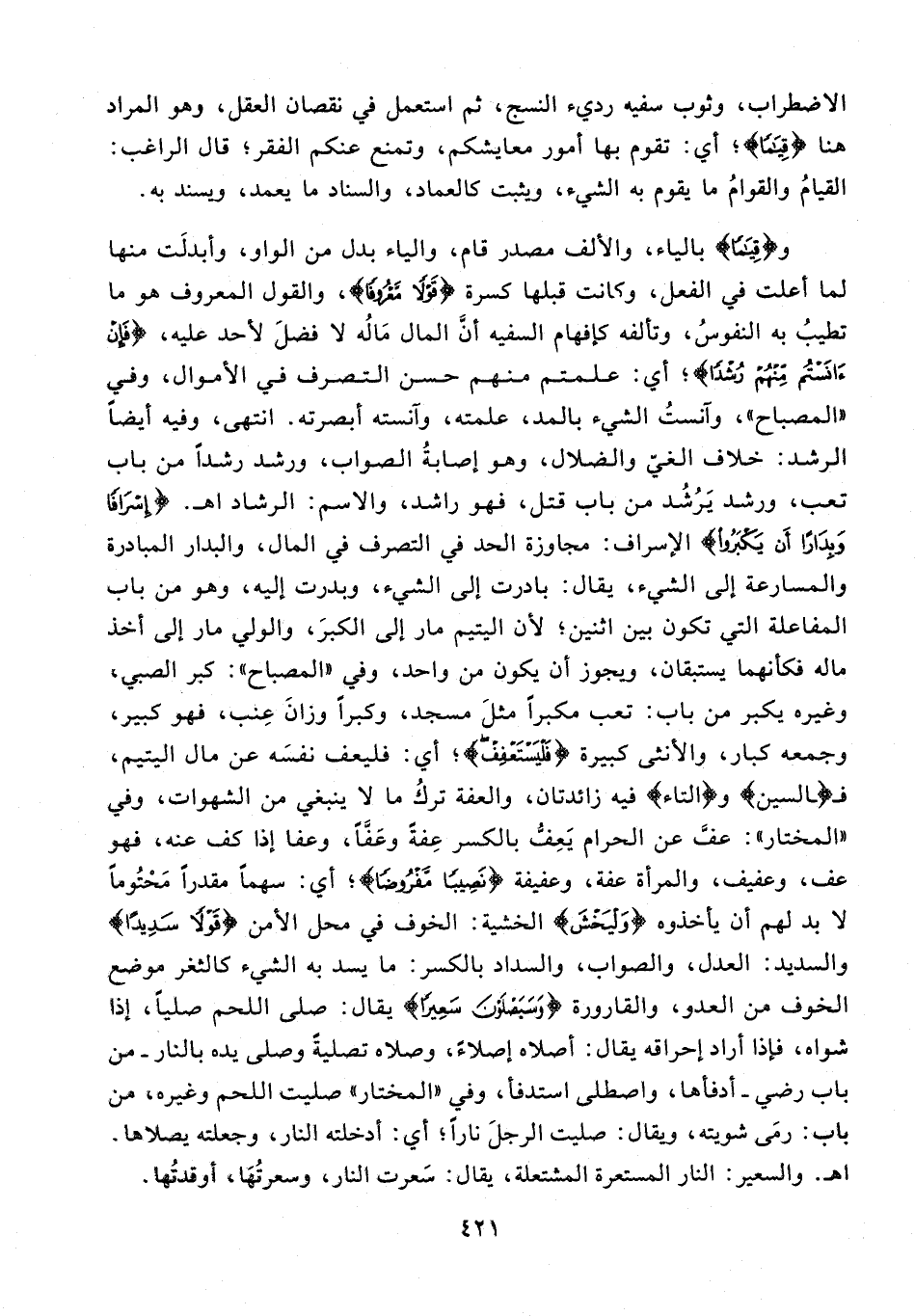 و {قِيَامًا} بالياء، والألف مصدر قام، والياء بدل من الواو، وأبدلَت منها لما أعلت في الفعل، وكانت قبلها كسرة {قَوْلًا مَعْرُوفًا}، والقول المعروف هو ما تطيبُ به النفوسُ، وتألفه كإفهام السفيه أنَّ المال مَالُه لا فضلَ لأحد عليه، {فَإِنْ آنَسْتُمْ مِنْهُمْ رُشْدًا}؛ أي: علمتم منهم حسن التصرف في الأموال، وفي "المصباح"، وآنستُ الشيء بالمد، علمته، وآنسته أبصرته. انتهى، وفيه أيضًا الرشد: خلاف العيّ والضلال، وهو إصابةُ الصواب، ورشد رشدًا من باب تعب، ورشد يَرُشُد من باب قتل، فهو راشد، والاسم: الرشاد اهـ. {إِسْرَافًا وَبِدَارًا أَنْ يَكْبَرُوا} الإسراف: مجاوزة الحد في التصرف في المال، والبدار المبادرة والمسارعة إلى الشيء، يقال: بادرت إلى الشيء، وبدرت إليه، وهو من باب المفاعلة التي تكون بين اثنين؛ لأن اليتيم مار إلى الكبرَ، والولي مار إلى أخذ ماله فكأنهما يستبقان، ويجوز أن يكون من واحد، وفي "المصباح": كبر الصبي، وغيره يكبر من باب: تعب مكبرًا مثلَ مسجد، وكبرًا وزانَ عِنب، فهو كبير، وجمعه كبار، والأنثى كبيرة {فَلْيَسْتَعْفِفْ}؛ أي: فليعف نفسَه عن مال اليتيم، فـ {السين} و {التاء} فيه زائدتان، والعفة تركُ ما لا ينبغي من الشهوات، وفي "المختار": عفَّ عن الحرام يَعِفُّ بالكسر عِفةً وعَفًّا، وعفا إذا كف عنه، فهو عف، وعفيف، والمرأة عفة، وعفيفة {نَصِيبًا مَفْرُوضًا}؛ أي: سهمًا مقدرًا مَحْتُومًا لا بد لهم أن يأخذوه {وَلْيَخْشَ} الخشية: الخوف في محل الأمن {قَوْلًا سَدِيدًا} والسديد: العدل، والصواب، والسداد بالكسر: ما يسد به الشيء كالثغر موضع الخوف من العدو، والقارورة {وَسَيَصْلَوْنَ سَعِيرًا} يقال: صلى اللحم صليًا، إذا شواه، فإذا أراد إحراقه يقال: أصلاه إصلاءً، وصلاه تصليةً وصلى يده بالنار - من باب رضي - أدفأها، واصطلى استدفأ، وفي "المختار" صليت اللحم وغيره؛ من باب: رمَى شويته، ويقال: صليت الرجلَ نارًا؛ أي: أدخلته النار، وجعلته يصلاها. اهـ. والسعير: النار المستعرة المشتعلة، يقال: سَعرت النار، وسعرتُهَا، أوقدتُها.