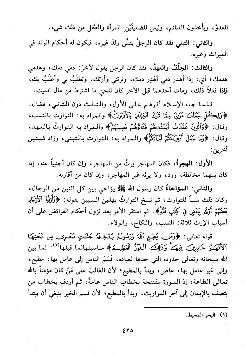 فلما جاء الإِسلام أقرهم على الأول، والثالث دون الثاني، فقال: {وَلِكُلٍّ جَعَلْنَا مَوَالِيَ مِمَّا تَرَكَ الْوَالِدَانِ وَالْأَقْرَبُونَ} والمراد به: التوارث بالنسب، وقال: {وَالَّذِينَ عَقَدَتْ أَيْمَانُكُمْ فَآتُوهُمْ نَصِيبَهُمْ} والمراد به التوارثُ بالعهد، وقال: {وَمَا جَعَلَ أَدْعِيَاءَكُمْ أَبْنَاءَكُمْ} والمراد به: التوارث بالتبني، وزاد شيئين آخرين: