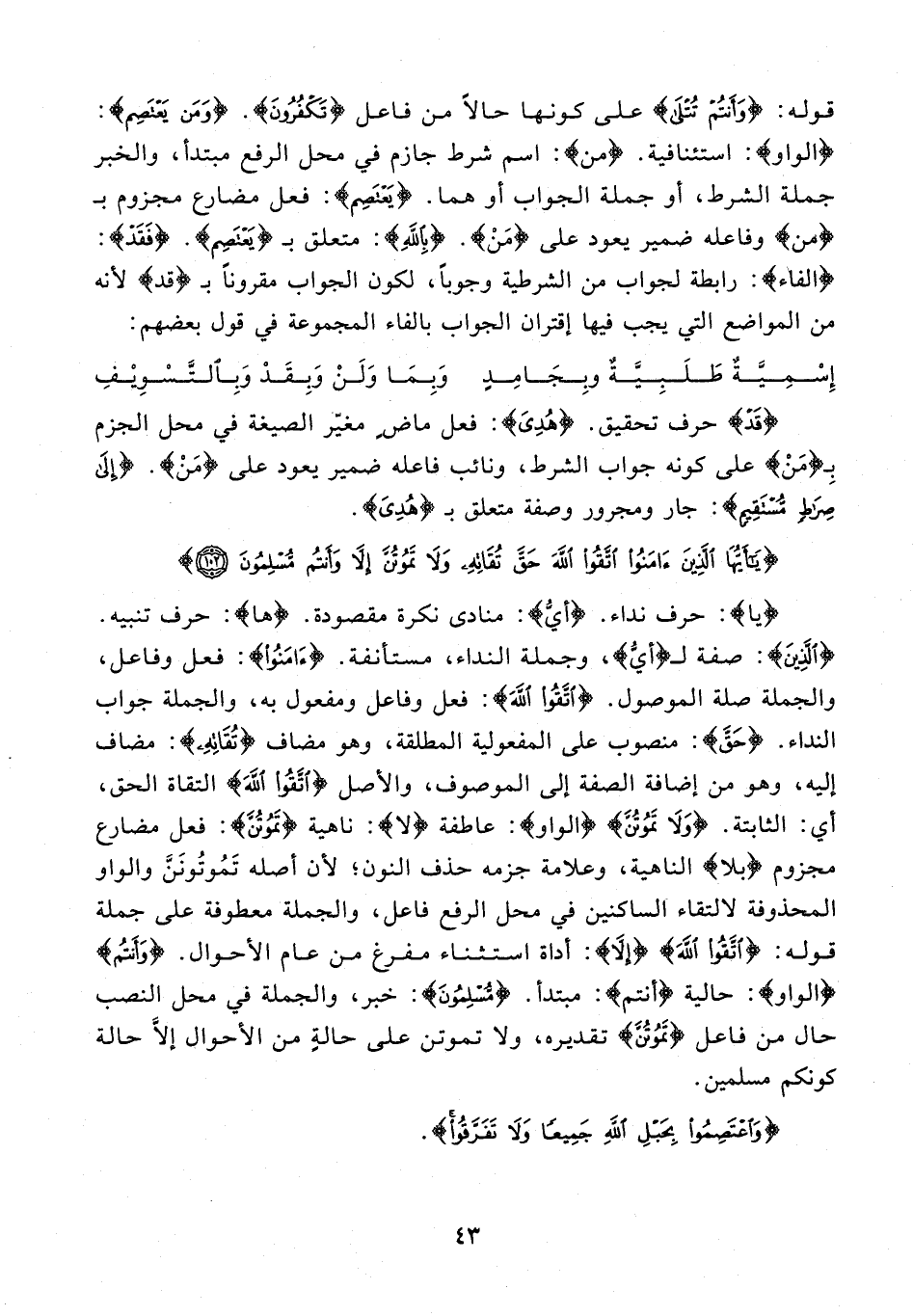 قوله: {وَأَنْتُمْ تُتْلَى} على كونها حالًا من فاعل {تَكْفُرُونَ}. {وَمَنْ يَعْتَصِمْ}: {الواو}: استئنافية. {من}: اسم شرط جازم في محل الرفع مبتدأ، والخبر جملة الشرط، أو جملة الجواب أو هما. {يَعْتَصِمْ}: فعل مضارع مجزوم بـ {مَنْ} وفاعله ضمير يعود على {مَنْ}. {بِاللَّهِ}: متعلق بـ {يَعْتَصِمْ}. {فَقَدْ}: {الفاء}: رابطة لجواب من الشرطية وجوبًا، لكون الجواب مقرونًا بـ {قد} لأنه من المواضع التي يجب فيها إقتران الجواب بالفاء المجموعة في قول بعضهم: