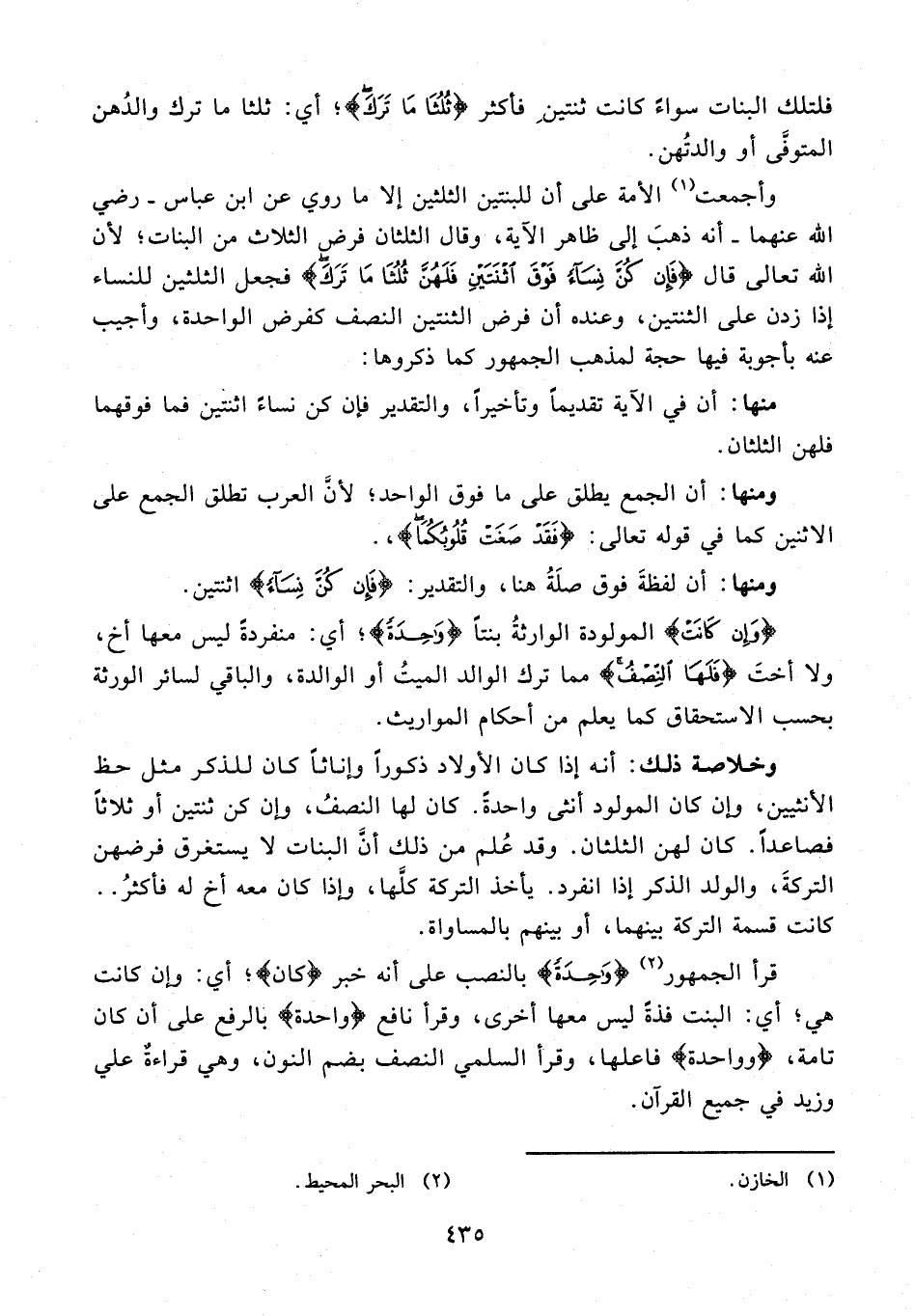وخلاصة ذلك: أنه إذا كان الأولاد ذكورًا وإناثًا كان للذكر مثل حظ الأنثيين، وإن كان المولود أنثى واحدةً. كان لها النصفُ، وإن كن ثنتين أو ثلاثًا فصاعدًا. كان لهن الثلثان. وقد عُلم من ذلك أنَّ البنات لا يستغرق فرضهن التركةَ، والولد الذكر إذا انفرد. يأخذ التركة كلَّها، وإذا كان معه أخ له فأكثرُ .. كانت قسمة التركة بينهما، أو بينهم بالمساواة.