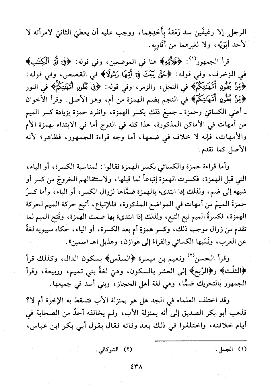 قرأ الجمهور (¬1): {فَلِأُمِّهِ} هنا في الموضعين، وفي قوله: {فِي أُمِّ الْكِتَابِ} في الزخرف، وفي قوله: {حَتَّى يَبْعَثَ فِي أُمِّهَا رَسُولًا} في القصص، وفي قوله: {مِنْ بُطُونِ أُمَّهَاتِكُمْ} في النحل، والزمر، وفي قوله: {فيِ بُطُونِ أُمَّهَاتِكُمْ} في النور {مِنْ بُطُونِ أُمَّهَاتِكُمْ} في النجم بضم الهمزة من أم، وهو الأصل. وقرأ الأخوان - أعني الكسائيَ وحمزة - جميعَ ذلك بكسر الهمزة، وانفرد حمزة بزيادة كسر الميم من أمهات في الأماكن المذكورة، هذا كله في الدرج أما في الابتداء بهمزة الأم والأمهات، فإنه لا خلاف في ضمها، أما وجه قراءة الجمهور، فظاهر؛ لأنه الأصل كما تقدم.