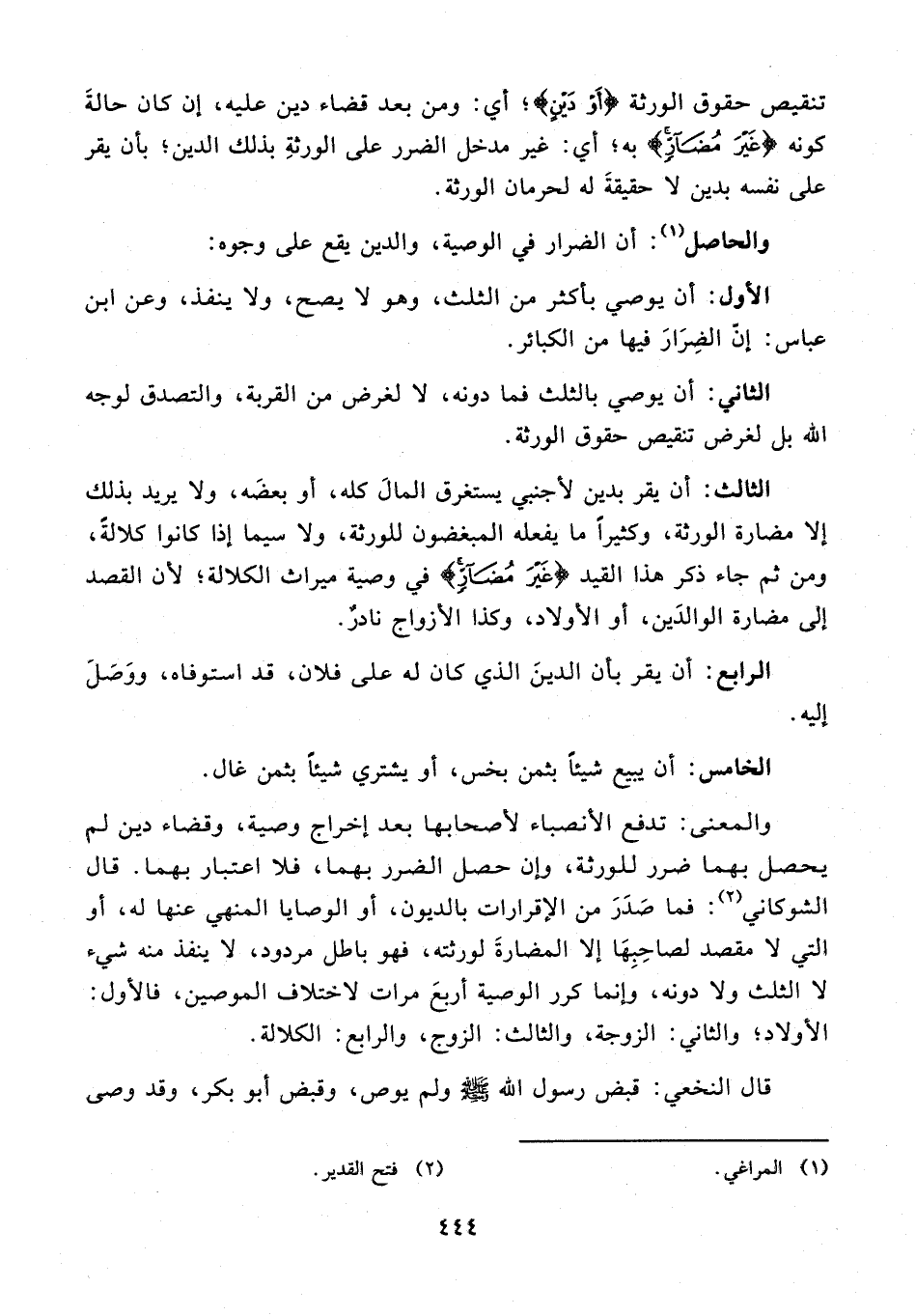 والمعنى: تدفع الأنصباء لأصحابها بعد إخراج وصية، وقضاء دين لم يحصل بهما ضرر للورثة، وإن حصل الضرر بهما، فلا اعتبار بهما. قال الشوكاني (¬2): فما صَدَرَ من الإقرارات بالديون، أو الوصايا المنهي عنها له، أو التي لا مقصد لصاحِبِهَا إلا المضارةَ لورثته، فهو باطل مردود، لا ينفذ منه شيء لا الثلث ولا دونه، وإنما كرر الوصية أربعَ مرات لاختلاف الموصين، فالأول: الأولاد؛ والثاني: الزوجة، والثالث: الزوج، والرابع: الكلالة.