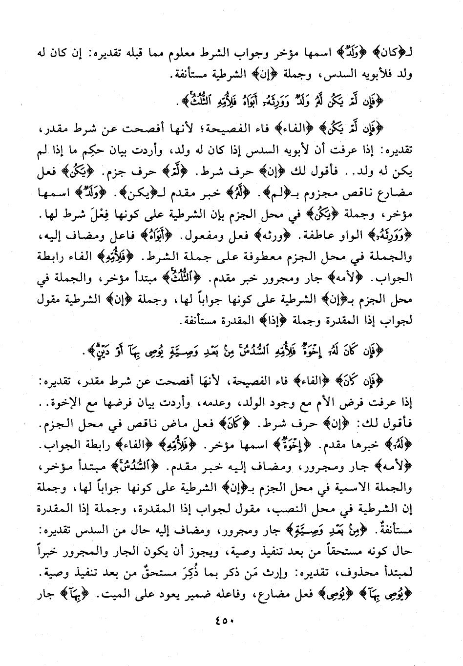 {فَإِنْ لَمْ يَكُنْ} {الفاء} فاء الفصيحة؛ لأنها أفصحت عن شرط مقدر، تقديره: إذا عرفت أن لأبويه السدس إذا كان له ولد، وأردت بيان حكم ما إذا لم يكن له ولد .. فأقول لك {إن} حرف شرط. {لَمْ} حرف جزم. {يَكُنْ} فعل مضارع ناقص مجزوم بـ {لم}. {لَهُ} خبر مقدم لـ {يكن}. {وَلَدٌ} اسمها مؤخر، وجملة {يَكُنْ} في محل الجزم بإن الشرطية على كونها فِعْلَ شرط لها. {وَوَرِثَهُ} الواو عاطفة. {ورثه} فعل ومفعول. {أَبَوَاهُ} فاعل ومضاف إليه، والجملة في محل الجزم معطوفة على جملة الشرط. {فلأمه} الفاء رابطة الجواب. {لأمه} جار ومجرور خبر مقدم. {الثُّلُثُ} مبتدأ مؤخر، والجملة في محل الجزم بـ {إن} الشرطية على كونها جوابًا لها، وجملة {إن} الشرطية مقول لجواب إذا المقدرة وجملة {إذا} المقدرة مستأنفة.