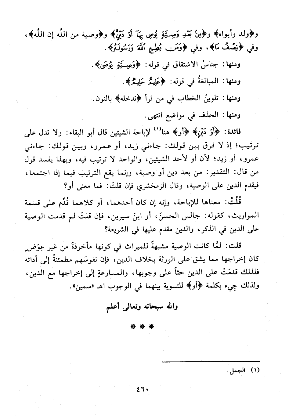 قُلْتُ: معناها للإباحة، وإنه إن كان أحدهما، أو كلاهما قُدِّم على قسمة المواريث، كقوله: جالس الحسنَ، أو ابنَ سيرين، فإن قلتَ لم قدمت الوصية على الدين في الذكر، والدين مقدم عليها في الشريعة؟