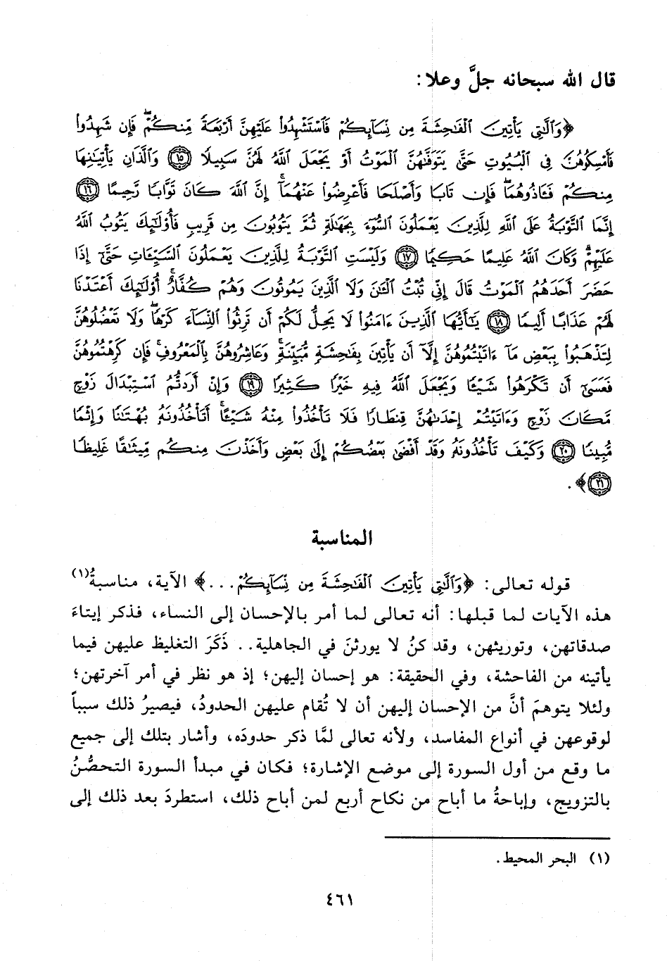 {وَاللَّاتِي يَأْتِينَ الْفَاحِشَةَ مِنْ نِسَائِكُمْ فَاسْتَشْهِدُوا عَلَيْهِنَّ أَرْبَعَةً مِنْكُمْ فَإِنْ شَهِدُوا فَأَمْسِكُوهُنَّ فِي الْبُيُوتِ حَتَّى يَتَوَفَّاهُنَّ الْمَوْتُ أَوْ يَجْعَلَ اللَّهُ لَهُنَّ سَبِيلًا (15) وَاللَّذَانِ يَأْتِيَانِهَا مِنْكُمْ فَآذُوهُمَا فَإِنْ تَابَا وَأَصْلَحَا فَأَعْرِضُوا عَنْهُمَا إِنَّ اللَّهَ كَانَ تَوَّابًا رَحِيمًا (16) إِنَّمَا التَّوْبَةُ عَلَى اللَّهِ لِلَّذِينَ يَعْمَلُونَ السُّوءَ بِجَهَالَةٍ ثُمَّ يَتُوبُونَ مِنْ قَرِيبٍ فَأُولَئِكَ يَتُوبُ اللَّهُ عَلَيْهِمْ وَكَانَ اللَّهُ عَلِيمًا حَكِيمًا (17) وَلَيْسَتِ التَّوْبَةُ لِلَّذِينَ يَعْمَلُونَ السَّيِّئَاتِ حَتَّى إِذَا حَضَرَ أَحَدَهُمُ الْمَوْتُ قَالَ إِنِّي تُبْتُ الْآنَ وَلَا الَّذِينَ يَمُوتُونَ وَهُمْ كُفَّارٌ أُولَئِكَ أَعْتَدْنَا لَهُمْ عَذَابًا أَلِيمًا (18) يَا أَيُّهَا الَّذِينَ آمَنُوا لَا يَحِلُّ لَكُمْ أَنْ تَرِثُوا النِّسَاءَ كَرْهًا وَلَا تَعْضُلُوهُنَّ لِتَذْهَبُوا بِبَعْضِ مَا آتَيْتُمُوهُنَّ إِلَّا أَنْ يَأْتِينَ بِفَاحِشَةٍ مُبَيِّنَةٍ وَعَاشِرُوهُنَّ بِالْمَعْرُوفِ فَإِنْ كَرِهْتُمُوهُنَّ فَعَسَى أَنْ تَكْرَهُوا شَيْئًا وَيَجْعَلَ اللَّهُ فِيهِ خَيْرًا كَثِيرًا (19) وَإِنْ أَرَدْتُمُ اسْتِبْدَالَ زَوْجٍ مَكَانَ زَوْجٍ وَآتَيْتُمْ إِحْدَاهُنَّ قِنْطَارًا فَلَا تَأْخُذُوا مِنْهُ شَيْئًا أَتَأْخُذُونَهُ بُهْتَانًا وَإِثْمًا مُبِينًا (20) وَكَيْفَ تَأْخُذُونَهُ وَقَدْ أَفْضَى بَعْضُكُمْ إِلَى بَعْضٍ وَأَخَذْنَ مِنْكُمْ مِيثَاقًا غَلِيظًا (21)}.